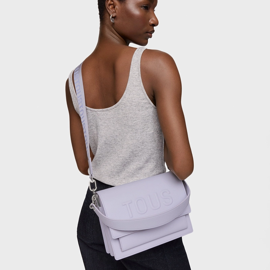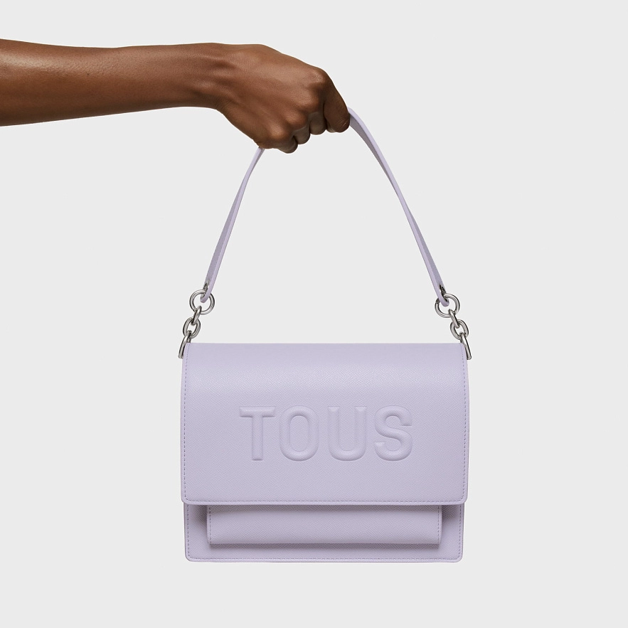 Сумка TOUS Audree из синтетического материала лилового цвета. Имеет клапан и застежку на две магнитные пуговицы. Имеет два отделения, разделенных застежкой-молнией, и открытый карман спереди. Фиксированная ручка на плечо и регулируемая и съемная ручка через плечо. Размеры (высота x ширина x глубина): 19 x 25 x 11,5 см.