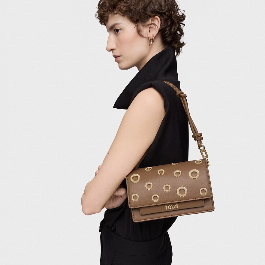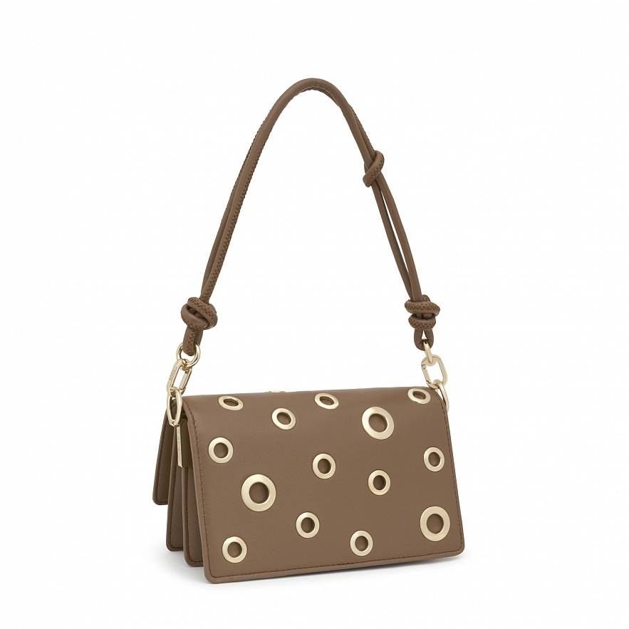 Сумка Audree Eyelets из коричневый полиуретана, среднего размера. Застежка на магнитных кнопках. Открытый карман спереди и два открытых отделения внутри. Съемный плечевой ремень, регулируемый и съемный наплечный ремень. Размеры (высота х ширина х глубина): 12 х 20 х 10,5 см.