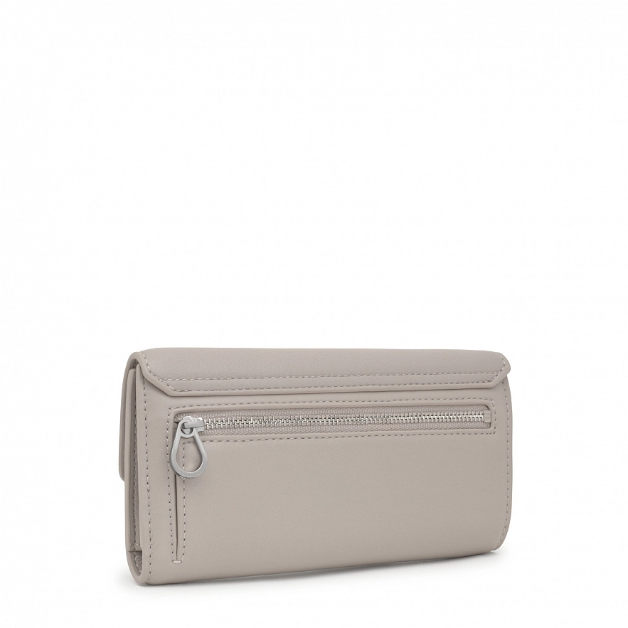 Кошелек TOUS Bloom из полиуретана, большой, серого цвета. Закрывается клапаном на две кнопки. Внутри двенадцать слотов для карточек, один из которых прозрачный, и отделение для купюр. Внешний карман на молнии для монет. Размеры (высота х ширина х глубина): 10 х 18 х 2 см.