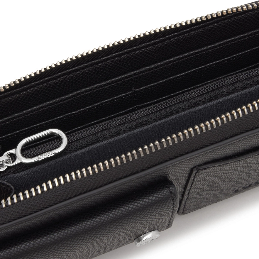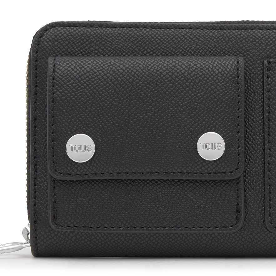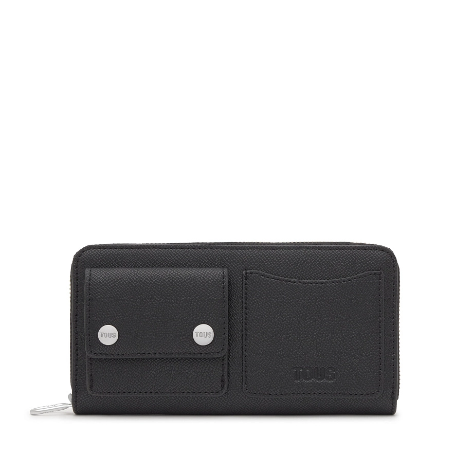 Кошелек TOUS Audree Pockets из полиуретана черного цвета. Застежка-молния. Внутри два открытых отделения для банкнот, отделение на молнии для монет и восемь слотов для карт. Размеры (высота x ширина x глубина): 10 x 19,2 x 4 см.