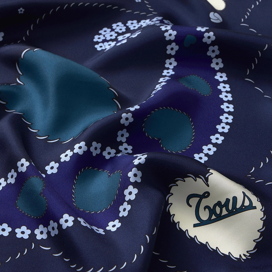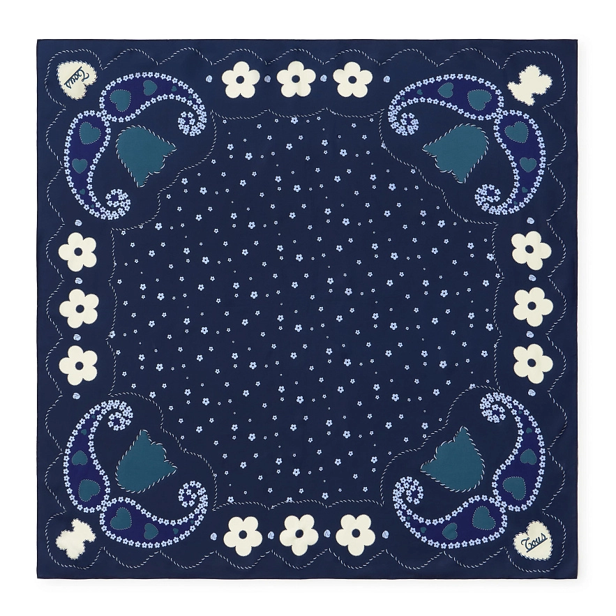 Платок TOUS Motifs Paisley квадратный, темно-синий с мотивами. Размеры: 120 x 120 см. Состав: 55% шелк, 45% хлопок.