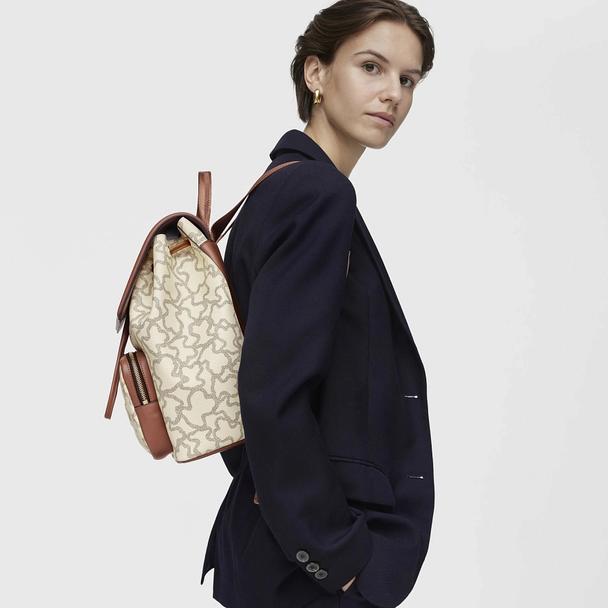Рюкзак TOUS Kaos Icon из синтетического материала с принтом бежевого и серого цветов с деталями из полиуретана. Основное отделение с магнитной застежкой и регулируемым шнурком. Внешний карман на молнии и внутренний открытый карман. Фиксированная ручка и регулируемые ремни через плечо. Размеры (высота x ширина x глубина): 34 x 36 x 23 см.
