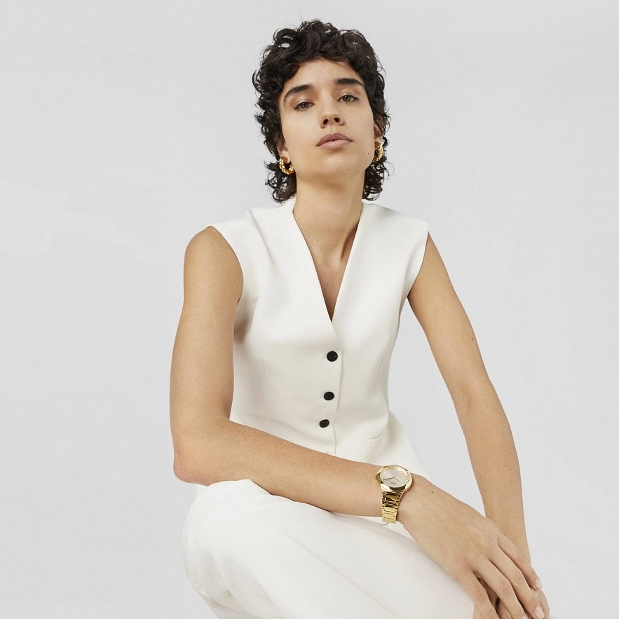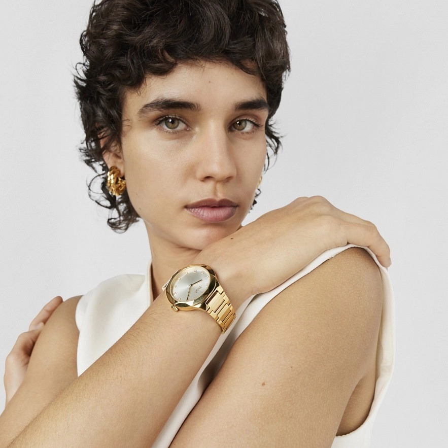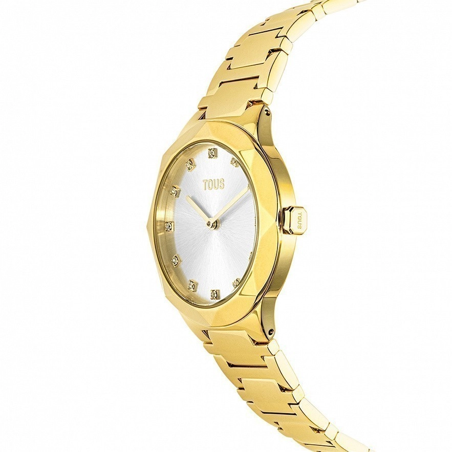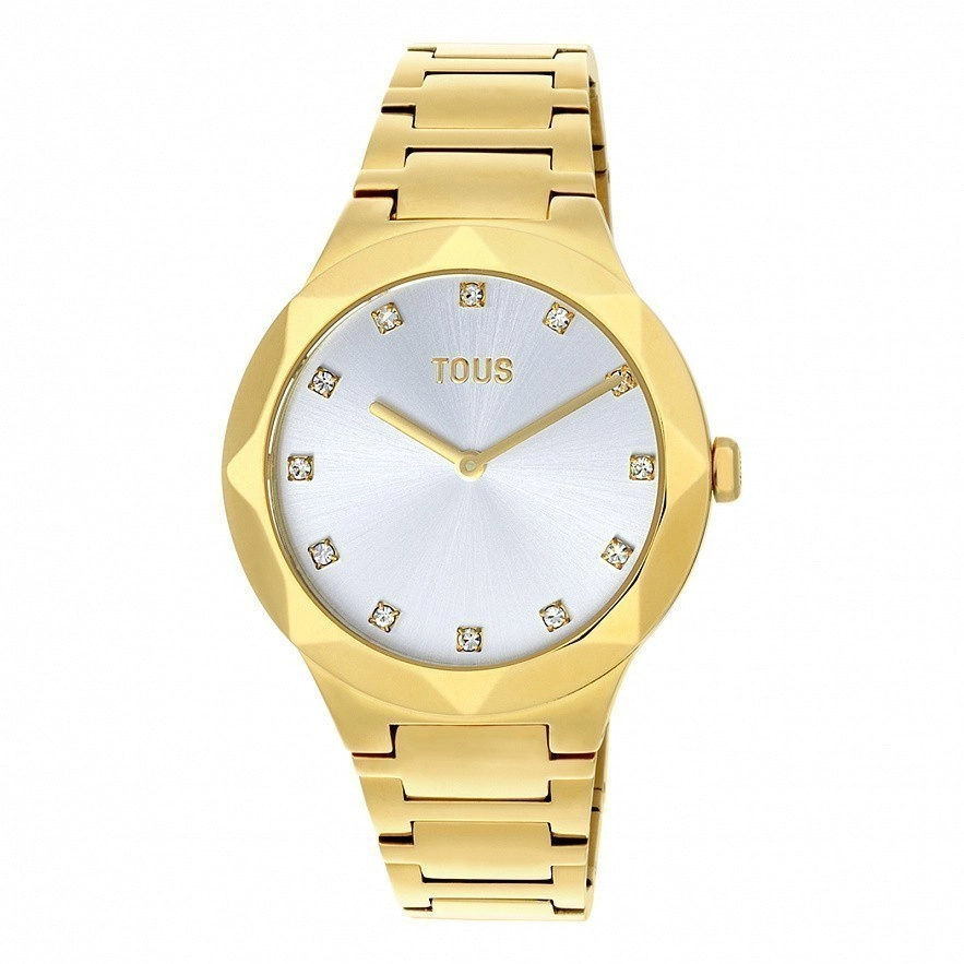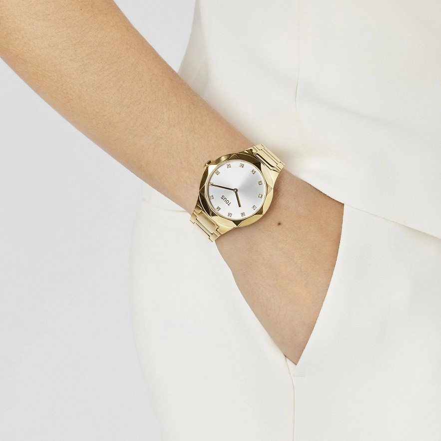 Аналоговые часы TOUS Karat Round с браслетом из стали IPG 316L золотистого цвета диаметром 36 мм и металлическим циферблатом с ограненными кристаллами на цифрах. Функции: часы и минуты. Водонепроницаемость при 5 атм. Батарея: 1,55 В, оксид серебра SR621SW / 0,30 грамм, японский кварцевый механизм. Откидная застежка с кнопками.