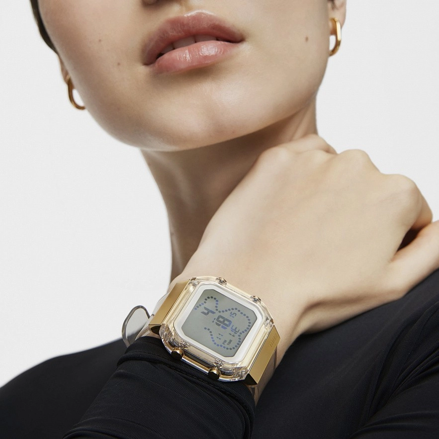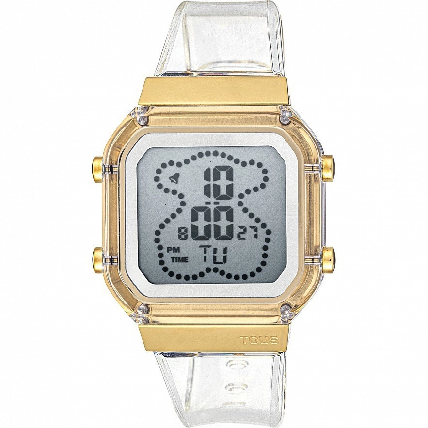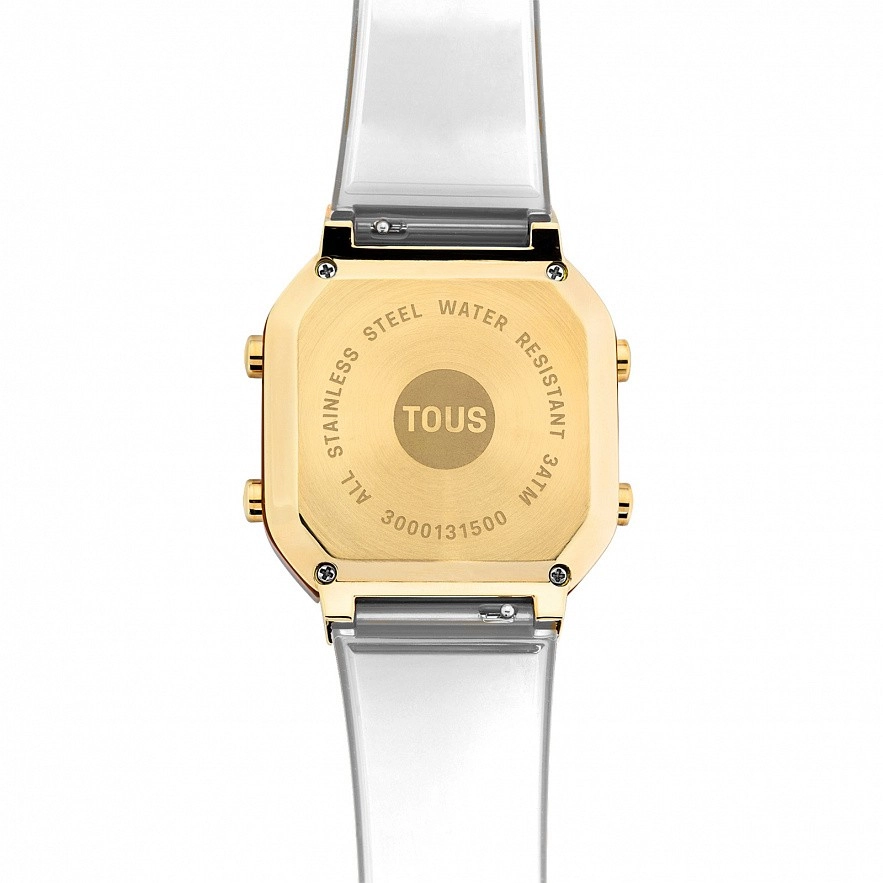 Цифровые часы TOUS D-BEAR с корпусом и ремешком из прозрачного поликарбоната в сочетании с деталями из стали IPG золотого цвета. Циферблат: металл/жидкокристаллический экран (LCD) с подсветкой. Диаметр корпуса: 36,5мм х 46,2мм. Функции: часы в 12 или 24-часовом формате, минуты, секунды, дата, месяц и день недели, часовой механизм, секундомер 1/100 секунды, таймер обратного отсчета и 5 будильников. Водонепроницаемый до 3 ATM. Батарейка: 3 В литиевая CR2025/2,5 г (литий 0,045 г). Калибр: CH1892. Кристалл: квадратный плоский. Обычная застежка со стальными петлями.