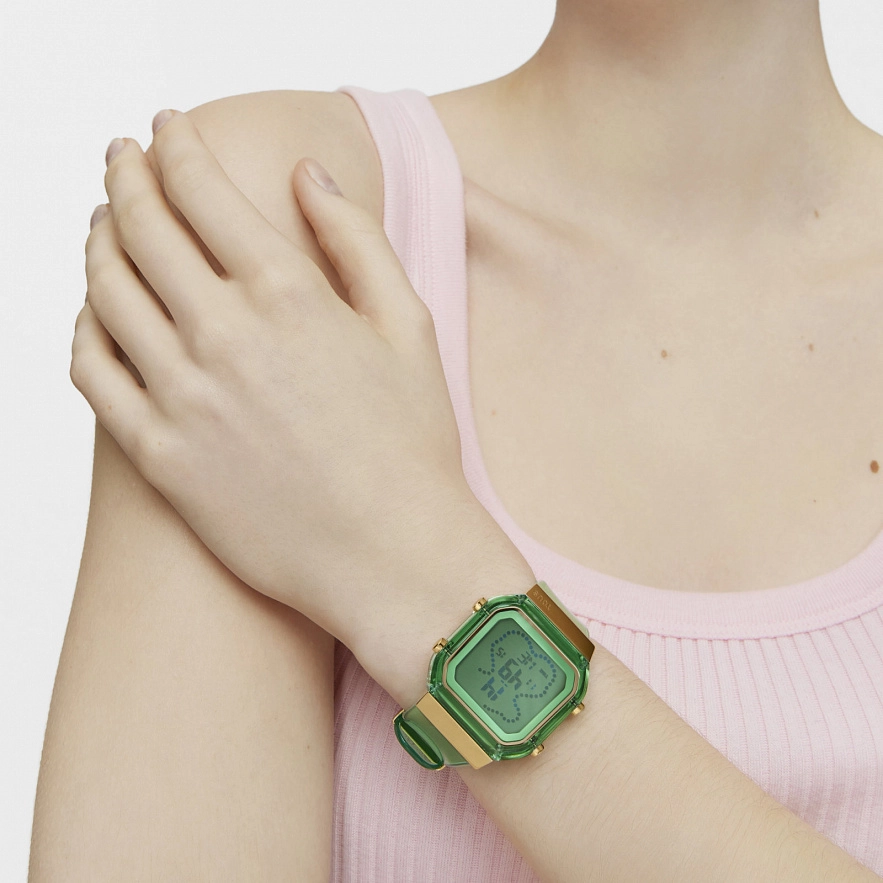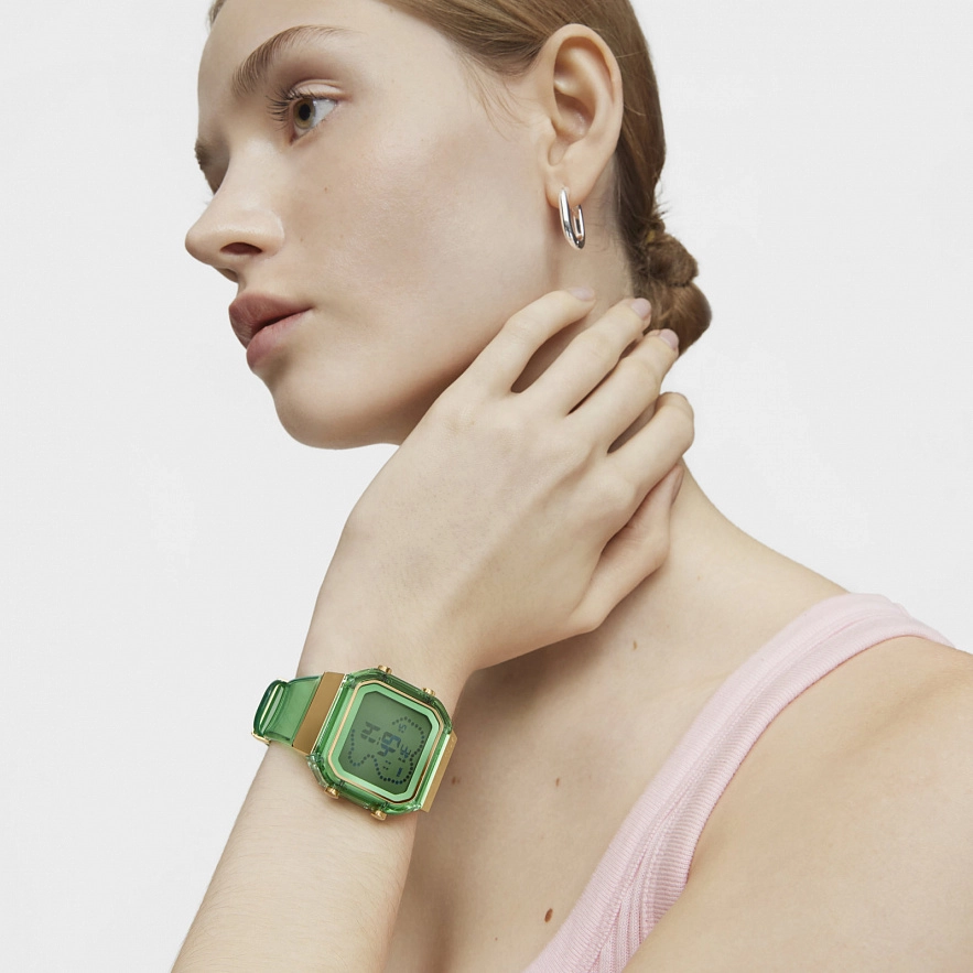 Цифровые часы D-BEAR с корпусом и ремешком из поликарбоната мятного цвета в сочетании с деталями из стали IPG золотистого цвета. Циферблат: металл/жидкокристаллический экран (LCD) с подсветкой. Диаметр корпуса: 36,5 мм х 46,2 мм. Функции: часы в 12 или 24-часовом формате, минуты, секунды, дата, месяц и день недели, часовой механизм, секундомер 1/100 секунды, таймер обратного отсчета и 5 будильников. Водонепроницаемые до 3 ATM. Батарейка: 3 В литиевая CR2025 / 2,5 грамма (литий 0,045 грамма). Калибр: CH1892. Кристалл: квадратный плоский. Застежка со стальными петлями.