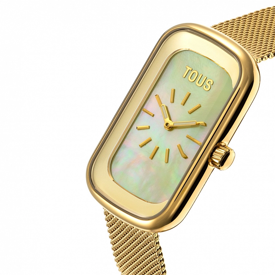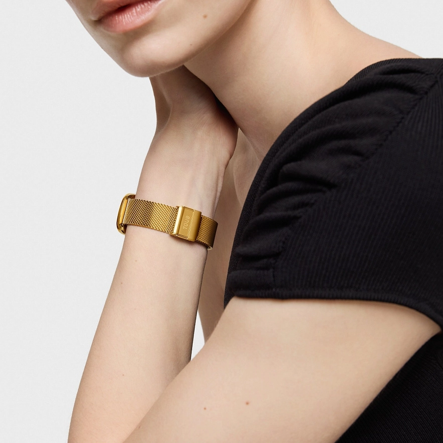 Часы TOUS T-Band Club с браслетом и корпусом из нержавеющей стали золотистого цвета. Диаметр корпуса: 26,5 мм х 44 мм. Циферблат: перламутровый. Функции: часы и минуты. Водонепроницаемый: 3 АТМ. Браслет: 16 мм х 16 мм х 87 мм / 16 мм х 16 мм х 110 мм. Регулируемая застежка с защитной застежкой.
