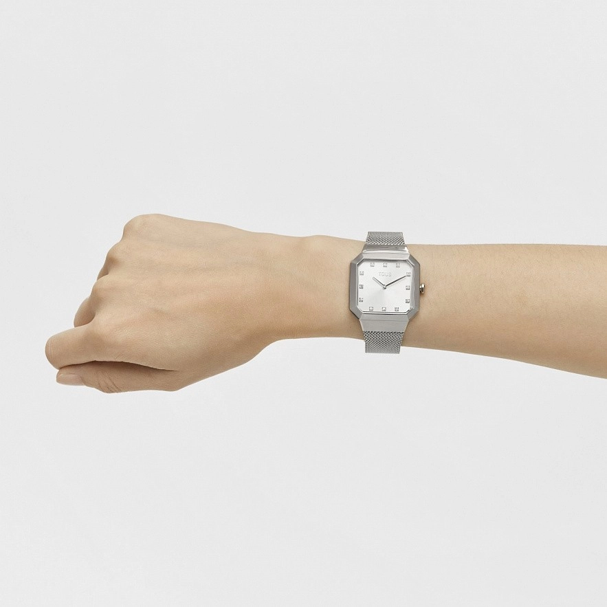 Часы TOUS Karat Squared из стали 316L. Размеры: 32 x 40 мм. Металлический циферблат с гранеными кристаллами на цифрах. Функции: часы и минуты. Водонепроницаемый при 3АТМ. Аккумулятор: 1,55 В оксид серебра SR626SW/0,30грамм. Квадратный минеральный кристалл. Японский кварцевый механизм.