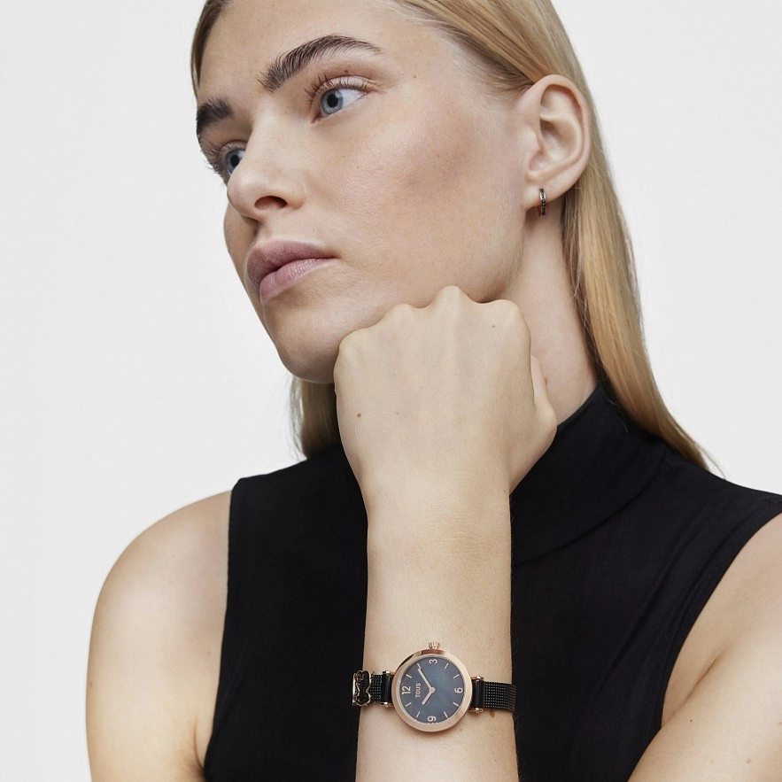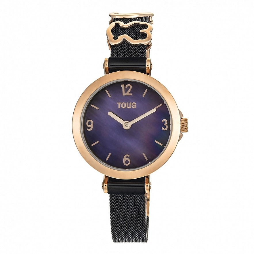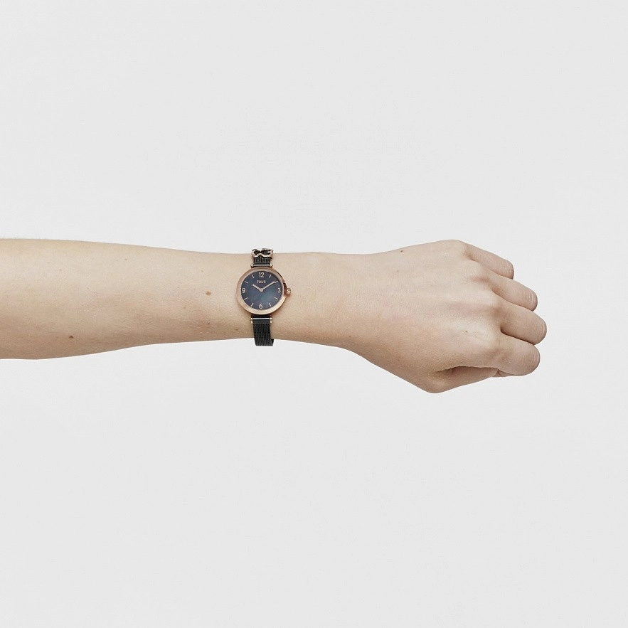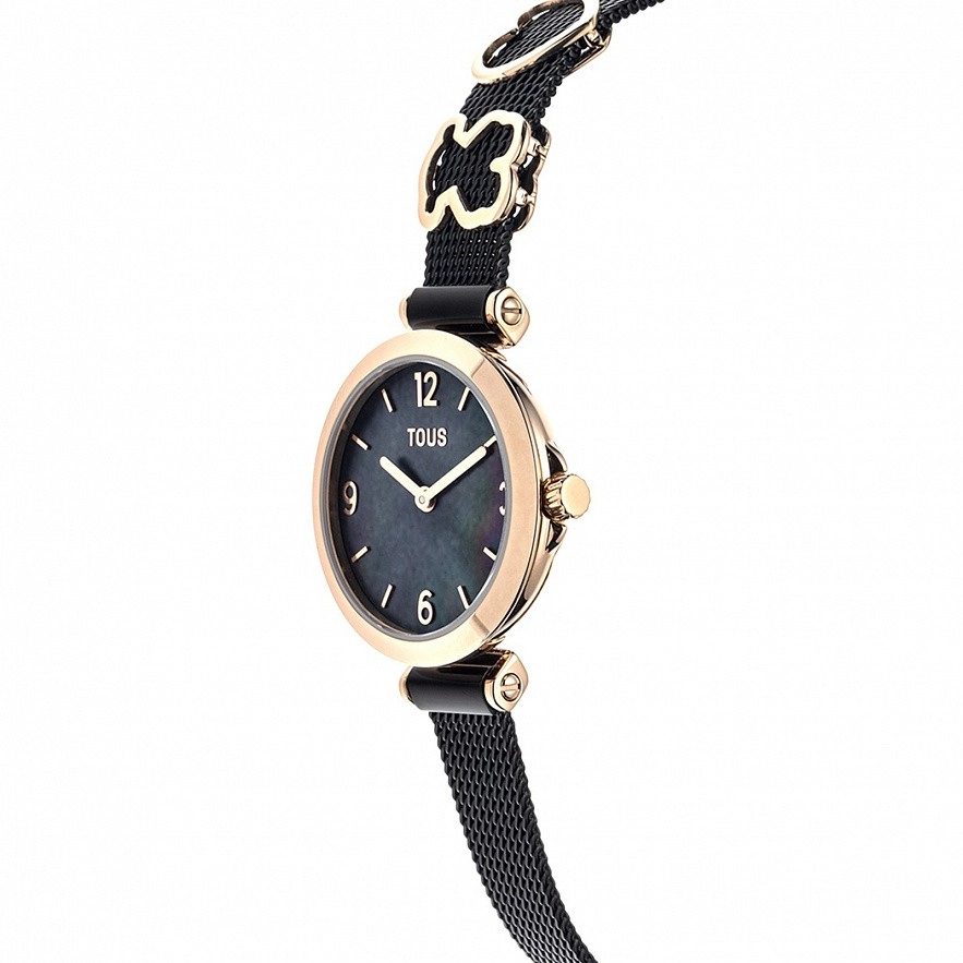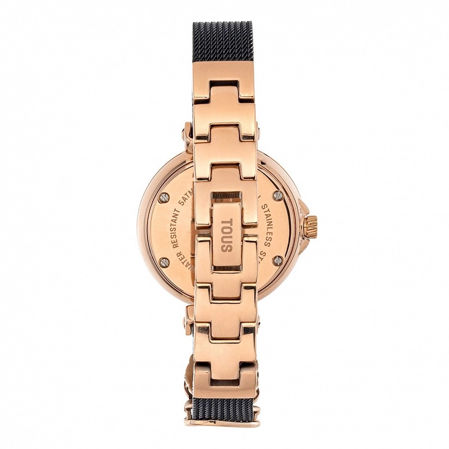Часы TOUS Icon Charms, браслет из черной стали IP и розовый стальной корпус IPRG. Диаметр: 29,5 мм. Функции: часы и минуты. Водонепроницаемый при 5АТМ.