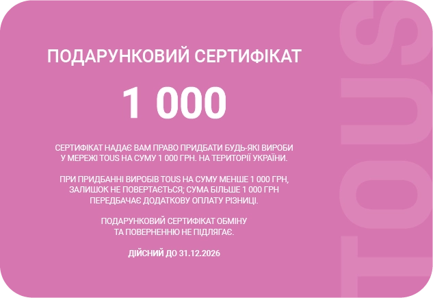 Заказывайте идеальный подарок - СЕРТИФИКАТ * TOUS. Сертификат дает возможность приобрести товары ТМ TOUS путем вычитания из розничной стоимости товара номинальной стоимости подарочного сертификата. Подарочный сертификат действует во всех магазинах TOUS на территории Украины и не подлежит возврату. Конечная дата действия сертификата указана на обратной стороне. *Сертификат - это физическое пластиковая карта с указанным номиналом.