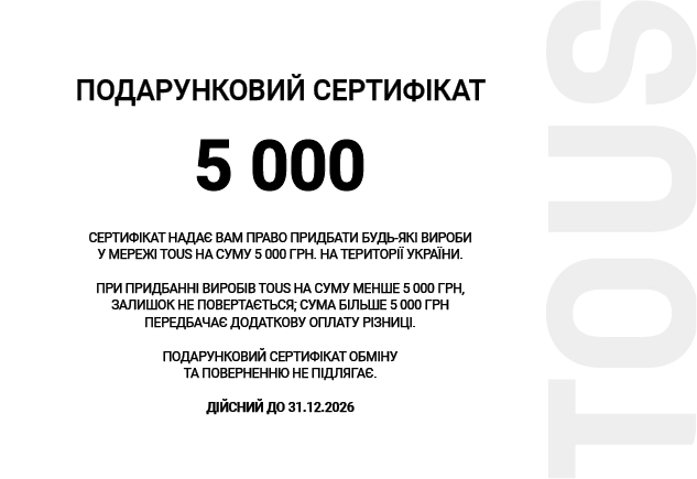 Заказывайте идеальный подарок - СЕРТИФИКАТ * TOUS. Сертификат дает возможность приобрести товары ТМ TOUS путем вычитания из розничной стоимости товара номинальной стоимости подарочного сертификата. Подарочный сертификат действует во всех магазинах TOUS на территории Украины и не подлежит возврату. Конечная дата действия сертификата указана на обратной стороне. *Сертификат - это физическое пластиковая карта с указанным номиналом.