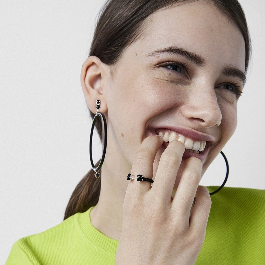Открытое кольцо TOUS Mesh Color из стали с черным ионным напылением, 2 медвежатами из оникса и каемкой из серебра высшей пробы. Размер медвежонка: 0,6 см. Ширина кольца: 3 мм.