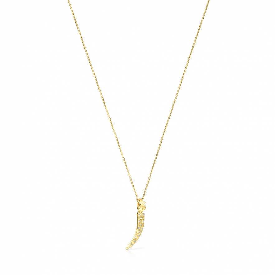 Колье TOUS Good Vibes с рогом изобилия из золота 18 карат с бриллиантами 0,06 карата, L/I огранки «восьмерка». Размер рога изобилия: 1,5 см. Длина колье: 42 см.