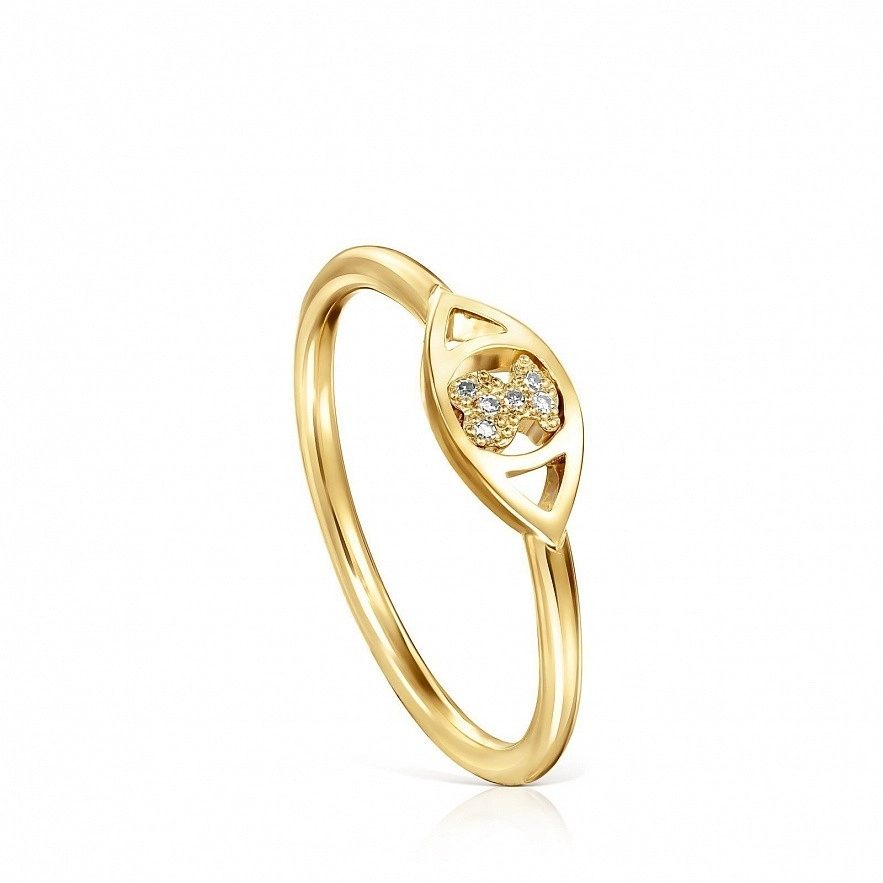 Кольцо TOUS Good Vibes с мишкой из желтого золота 18 карат и одногранными бриллиантами размера L/I, весом 0,02 карата. Размер мотива: 0,5см.