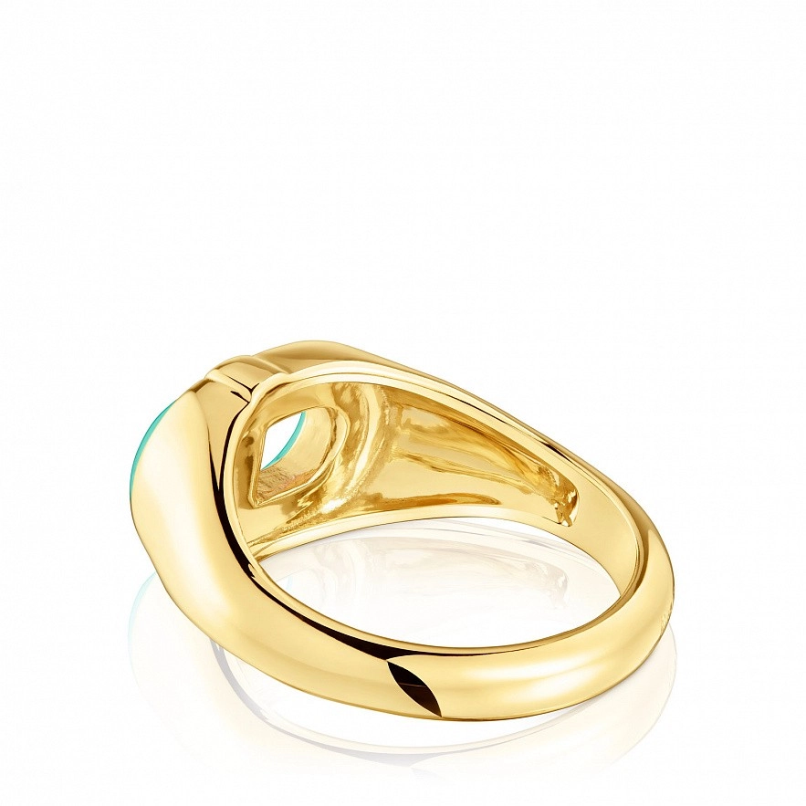 Кольцо-печатка TOUS Manifesto из серебра 925 пробы с покрытием Vermeil с центральным мотивом в зеленой эмали. Размер мотива: 9,8 х 13 мм. Толщина мотива: 3,6 мм. Толщина кольца: 1,7 мм.