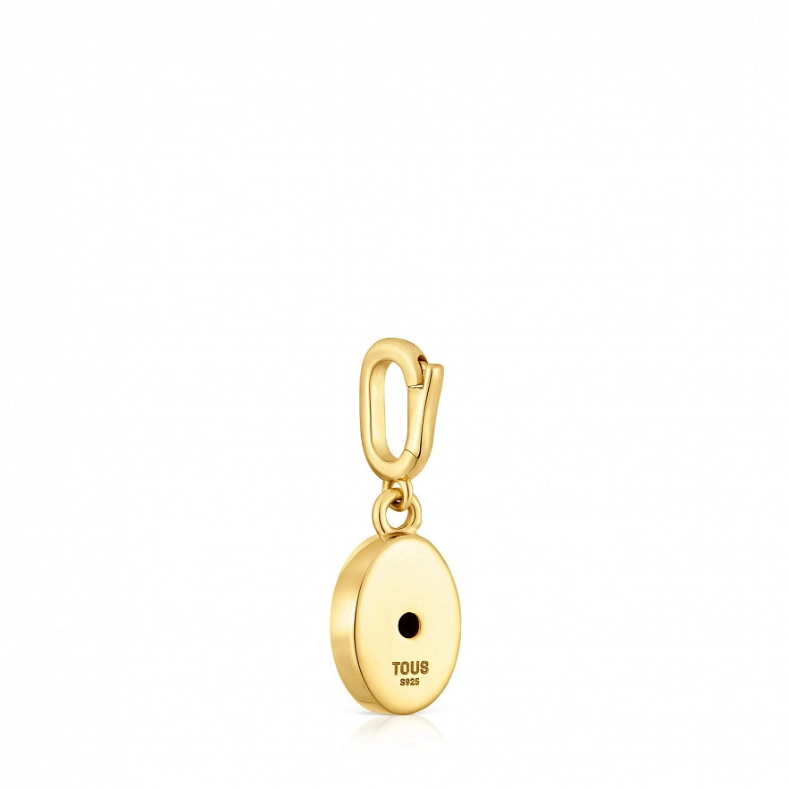 Кулон TOUS Medallions с покрытием из 18-каратного золота поверх серебра 925 проби. В центре черный овальный перламутр размером 8,3 х 5,2 мм, окруженный круглым граненым иолитом 1 мм и диопсидом хрома 2 мм. Размер кулона: 10 мм. Цепочка в комплект не входит.