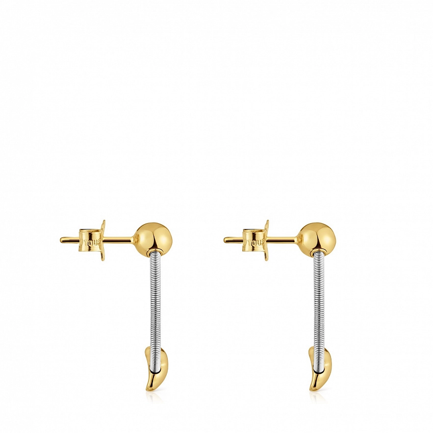 Серьги TOUS Mesh Tube из желтого золота 18 карат со стальным сетчатым кругом, соединенным золотым шариком на застежке, и мотивом мишки на нижней части.