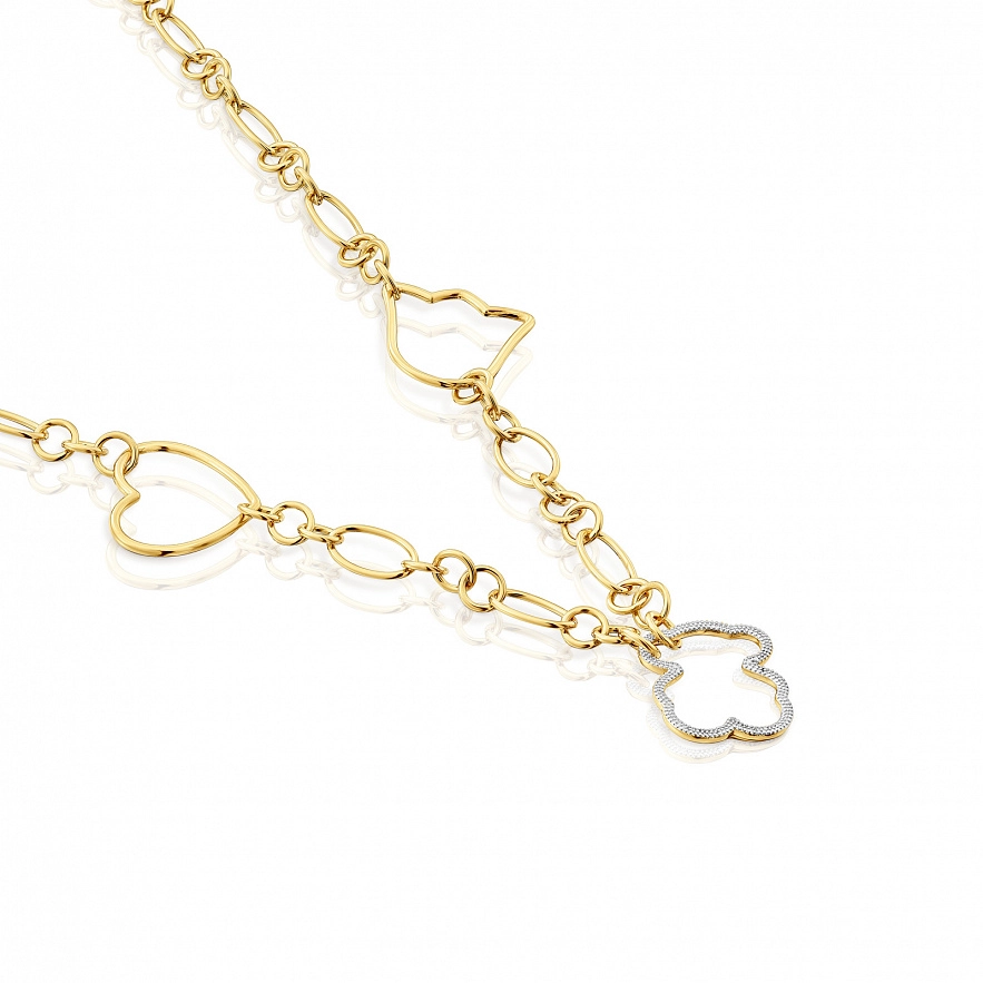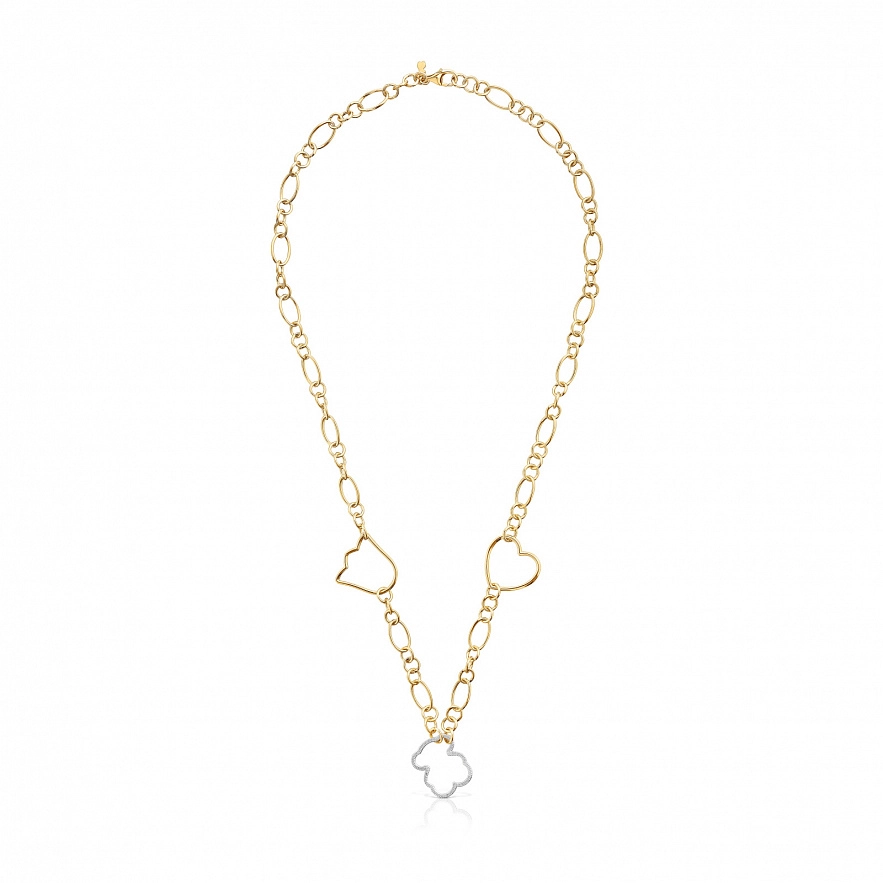 Колье TOUS New Silueta из серебра 925 пробы с покрытием Vermeil с декоративной техникой фрезерования, с белым родиевым покрытием и мотивами. Мотивы: тюльпан 16 мм, сердце 14,5 мм и мишка 16 мм из гранулированного серебра. Длина колье: 44 см. Застежка лобстер.