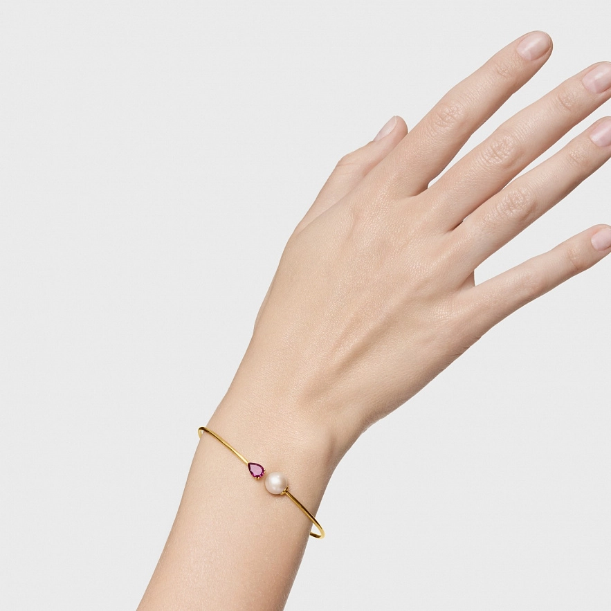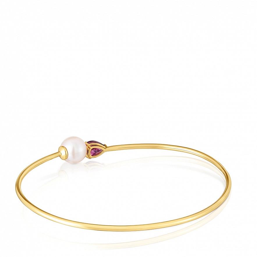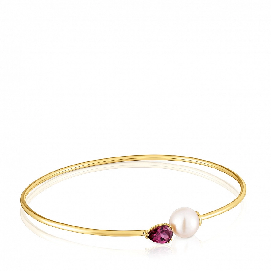 Браслет TOUS Ivette из желтого золота 18 карат с родолитом грушевидной огранки и культивированной пресноводной жемчужиной розового цвета. Размер драгоценного камня: 7 х 5 мм. Размер культивированного жемчуга: 8 мм. Длина браслета: 17 см.