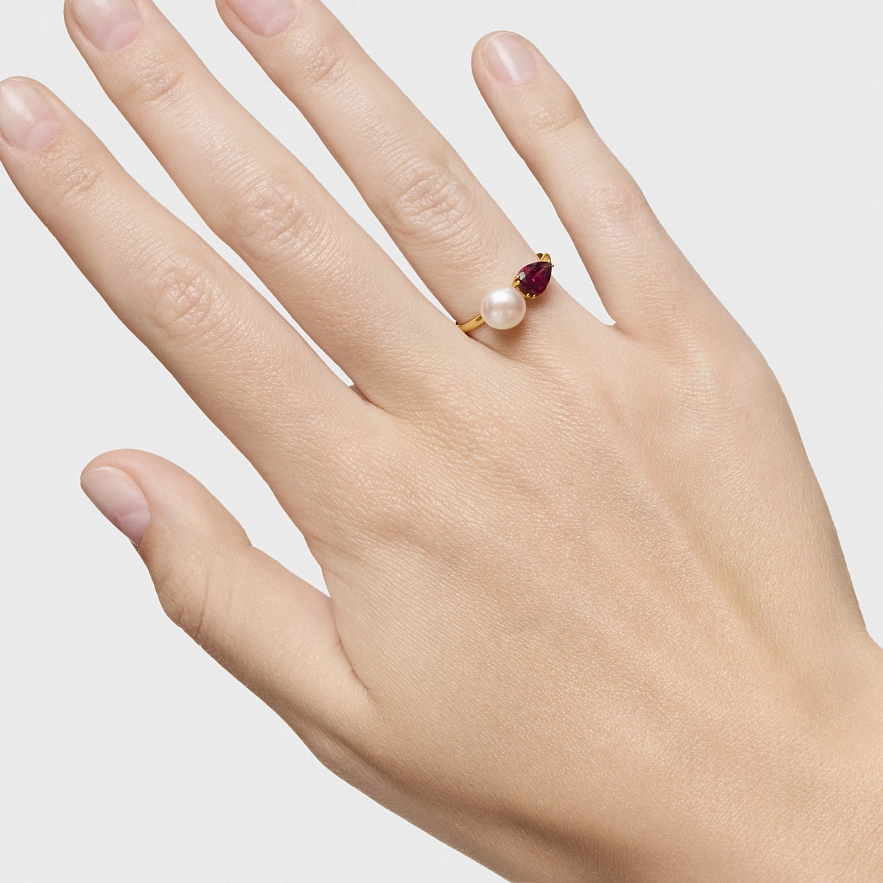Кольцо TOUS Ivette из желтого золота 18 карат с родолитом грушевидной огранки и культивированной пресноводной жемчужиной розового цвета. Размер драгоценного камня: 7 х 5 мм. Размер культивированного жемчуга: 7 - 7,5 мм.