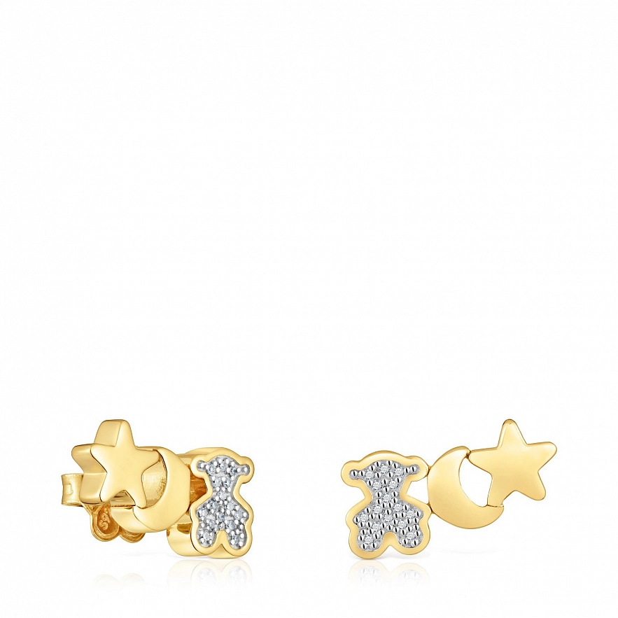 Серьги TOUS 1950 из серебра 925 пробы с покрытием Vermeil с мотивами и бриллиантами одинарной огранки весом 0,15 карата. Качество бриллиантов: 8x8 GH/SI. Мотивы: мишка, луна и сердце. Размер сережек: 21 мм.