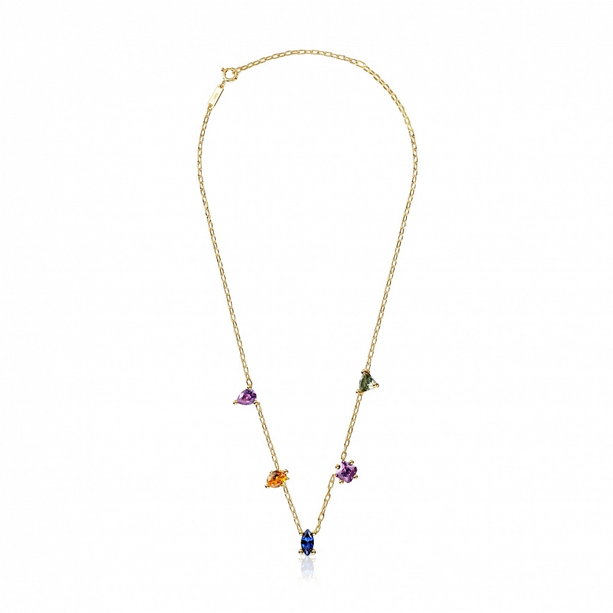 Ожерелье TOUS Color Lab из серебра 925 пробы с покрытием Vermeil , ограненный синтетический сапфир: синего, сиреневого цвета, желтого цвета; ограненная синтетическая шпинель зеленого цвета выращенная в лабаратории. Длина ожерелья: 45 см. Застежка-лобстер. Примечание: Изделие создано с использованием лабораторно выращенных драгоценных камней.