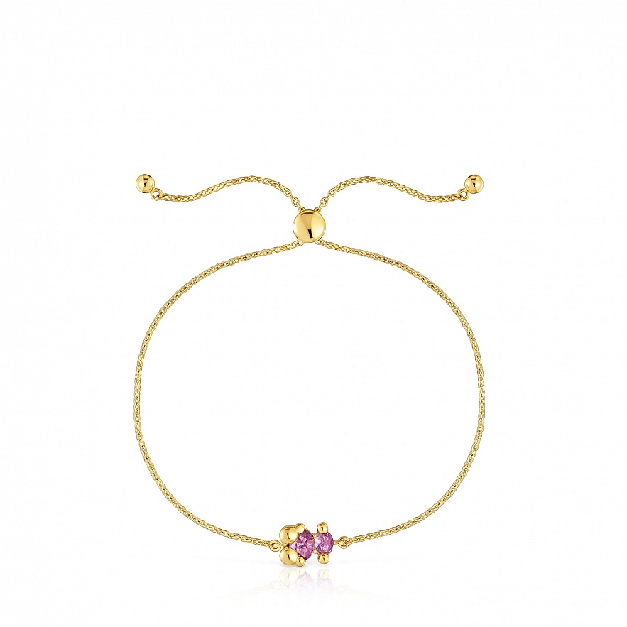Браслет TOUS Color Bear LGG из серебра 925 пробы с покрытием Vermeil и овальным ограненным сапфиром сиреневого цвета в форме мишки, выращенным в лаборатории. Размер мотива: 8 мм. Длина браслета: 25,5 см. Застежка-слайдер. Примечание: Изделие создано с использованием лабораторно выращенных драгоценных камней.