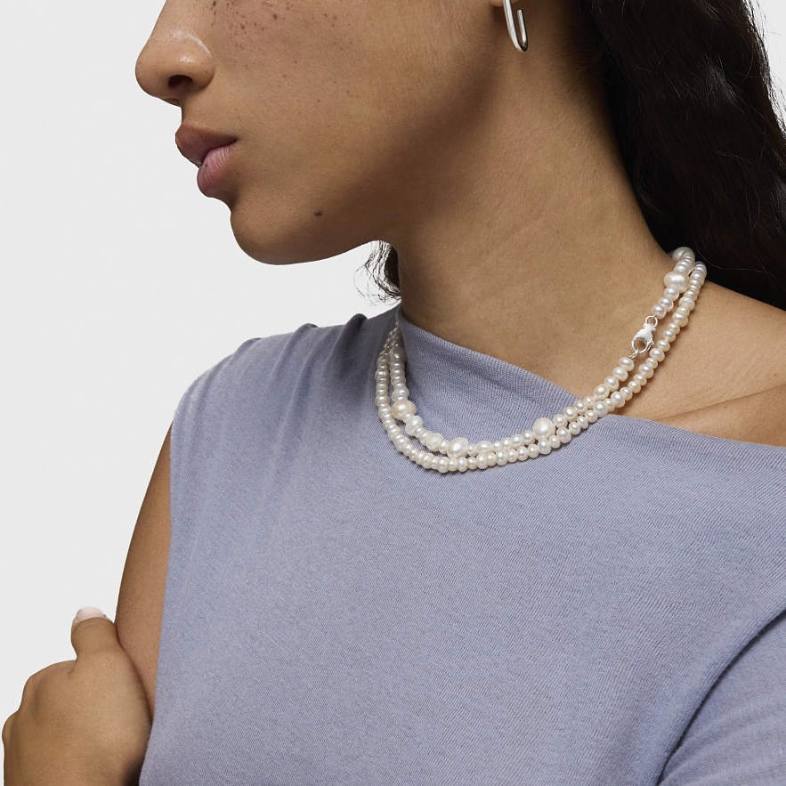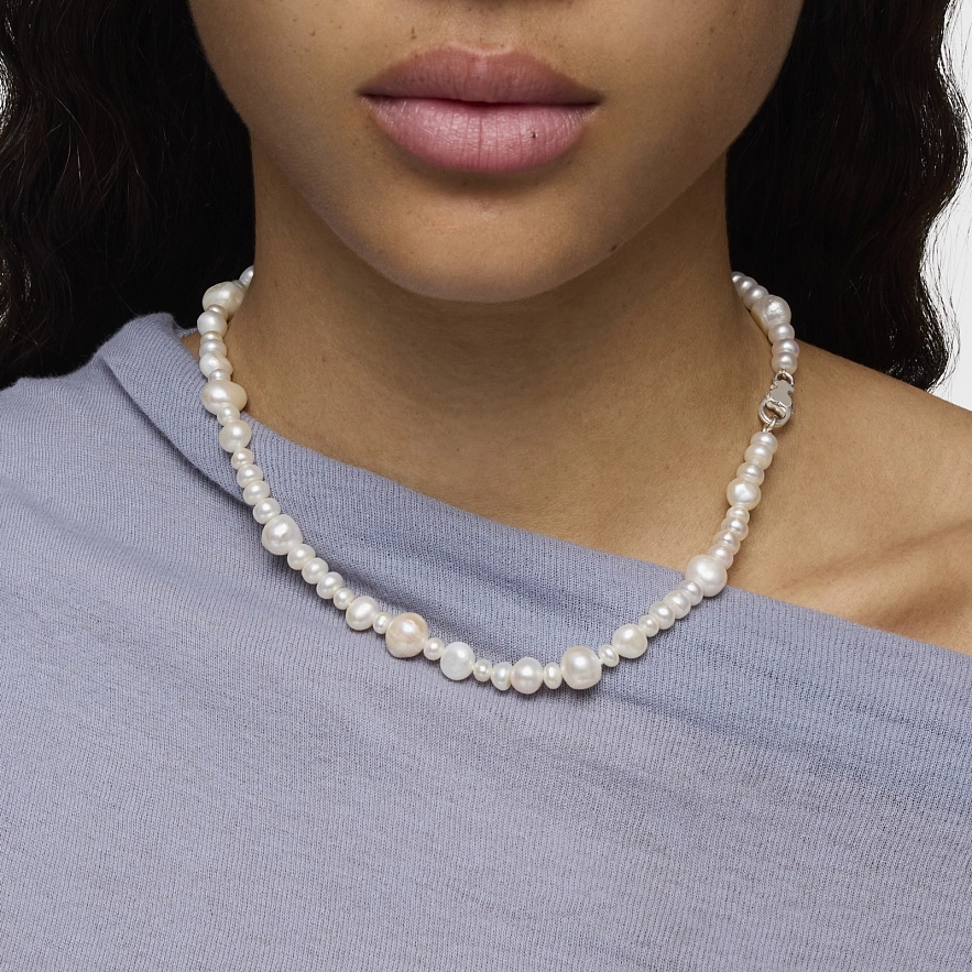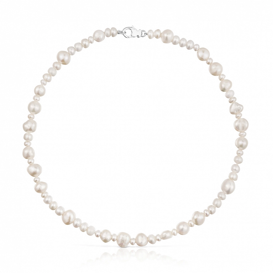 Колье TOUS Basic из серебра 925 пробы с культивированным пресноводным жемчугом разного размера. Размер культивированного жемчуга: от 4,5 до 10 мм. Длина колье: 42 см. Застежка в виде лобстера с мишкой.
