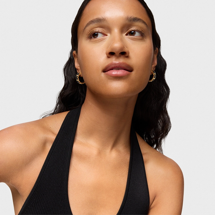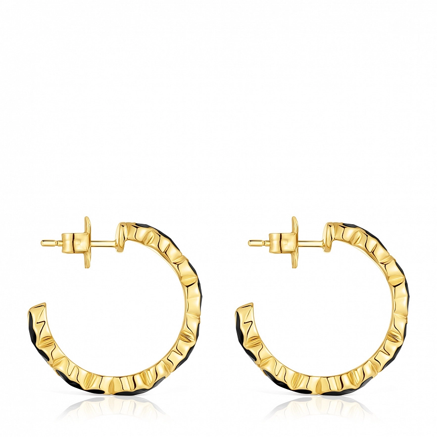 Серьги-кольца TOUS Icon Color из серебра 925 пробы с покрытием Vermeil и мотивами мишек из ограненного оникса. Размер шарма мишки: 8 мм. Размер сережек: 18 мм.