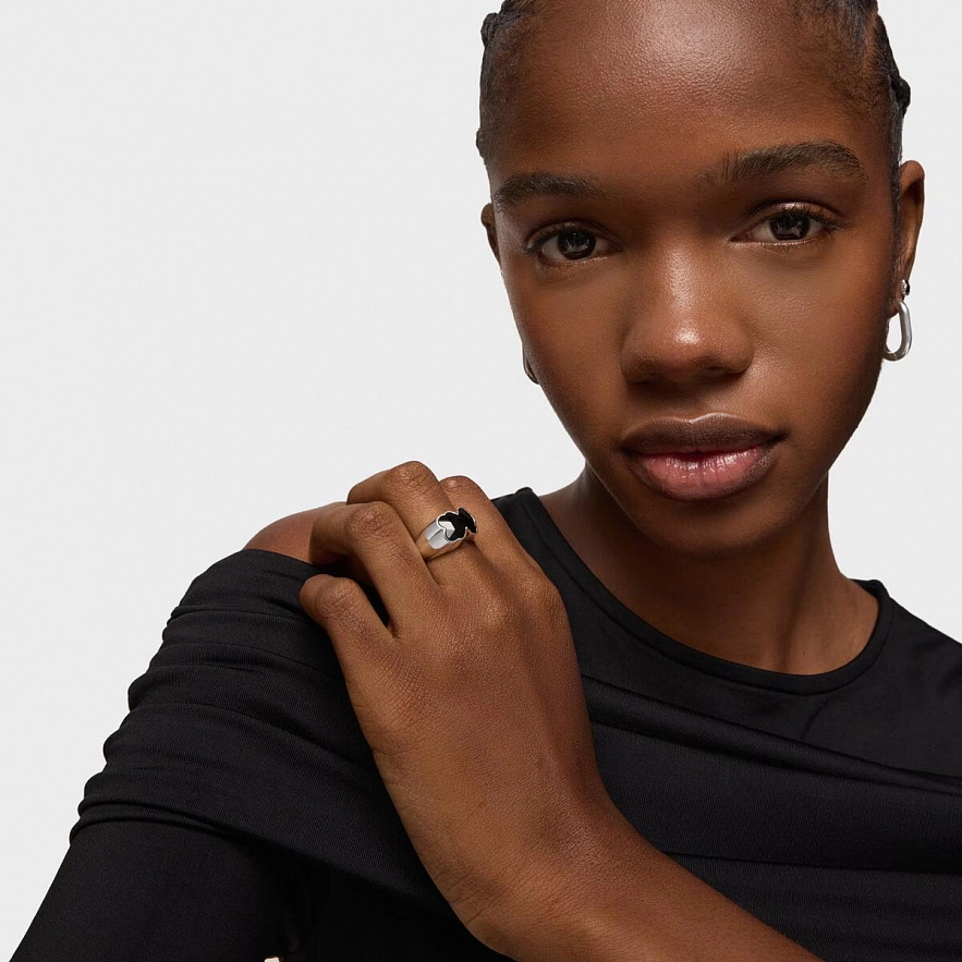 Кольцо TOUS Icon Color из серебра 925 пробы с мотивом мишки с ограненным ониксом. Размер мотива мишки: 11 мм. Высота кольца: 5 мм.