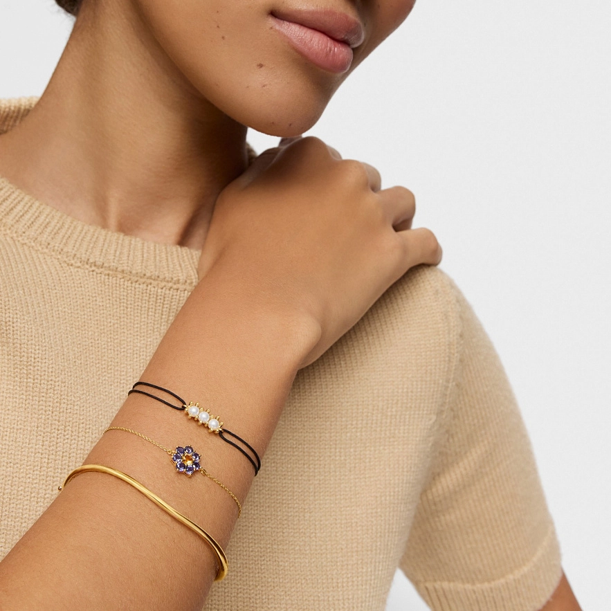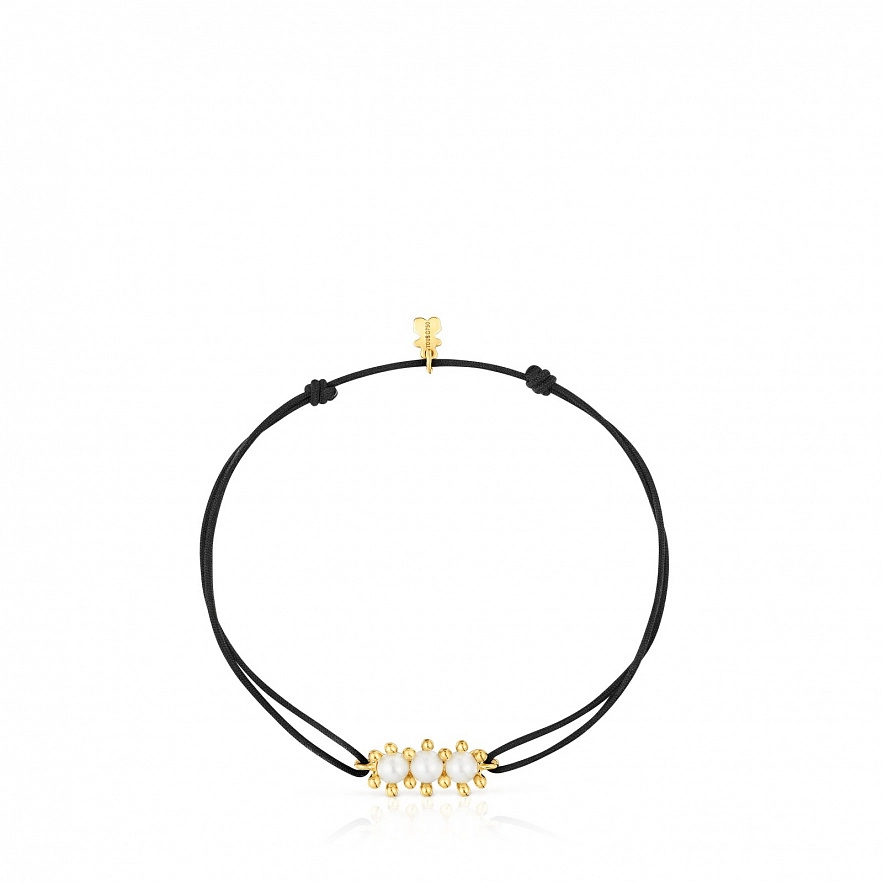 Браслет TOUS Daisy из желтого золота 18 карат, культивированного пресноводного жемчуга и черного нейлона. Размер мотива: 4 мм. Длина браслета: 17 см. Застежка-слайдер.