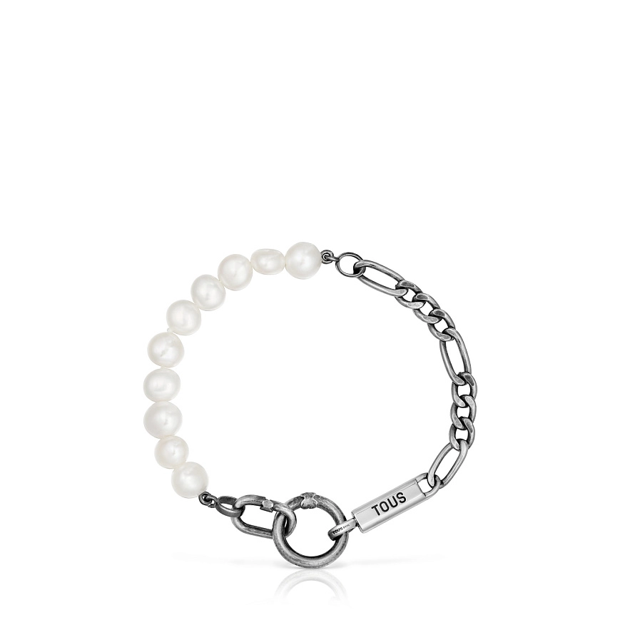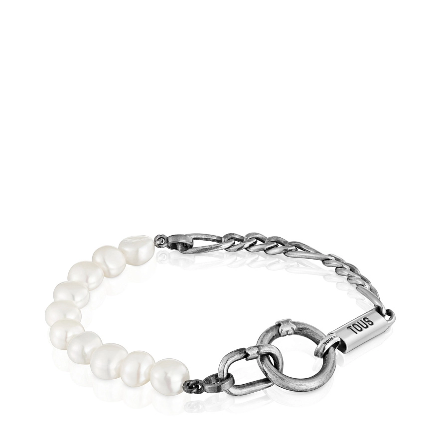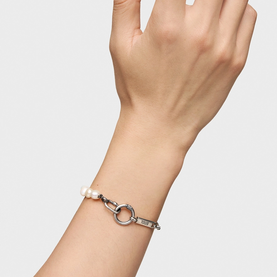 Браслет TOUS Hold Man с серебряной цепочкой и культивированными пресноводными жемчужинами. Размеры колец: 10x5 мм и 16 мм. Общая длина: 20,5 см. Застежка TOUS Hold.