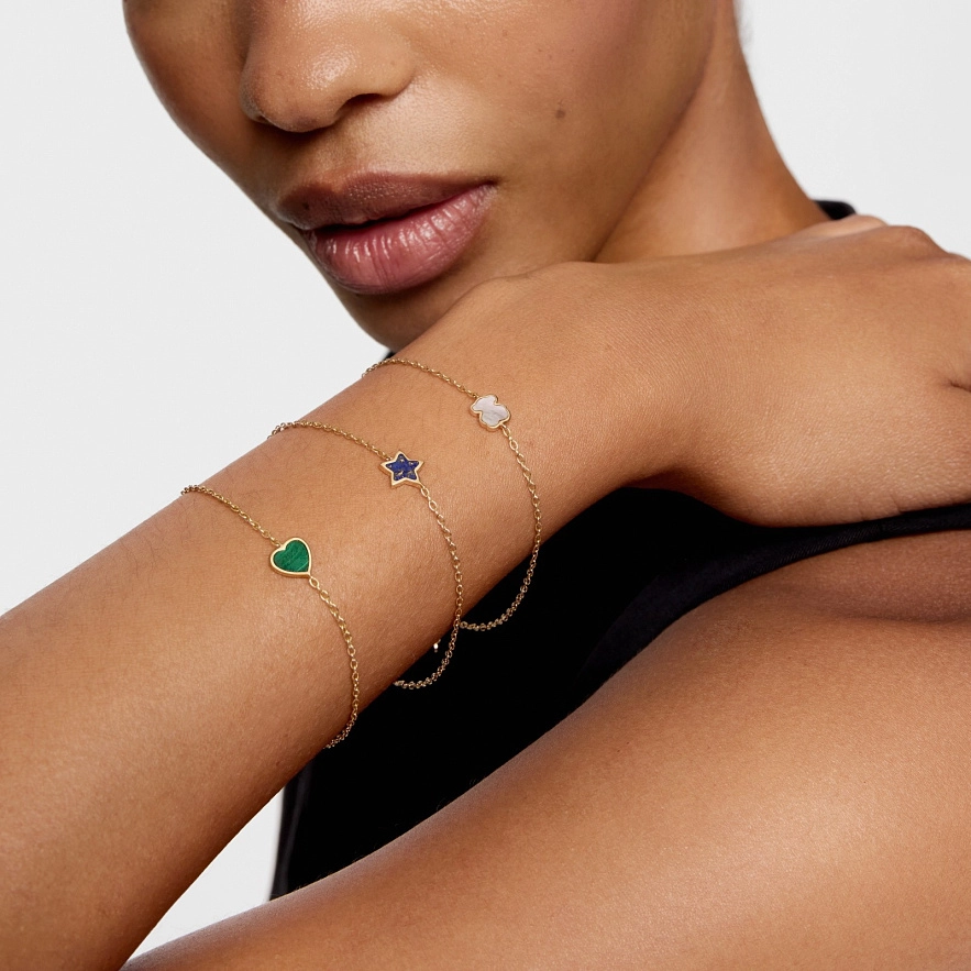 Браслет TOUS XXS из желтого золота 14 карат с ограненным малахитом в форме сердца. Длина браслета: 17 см. Застежка-лобстер.