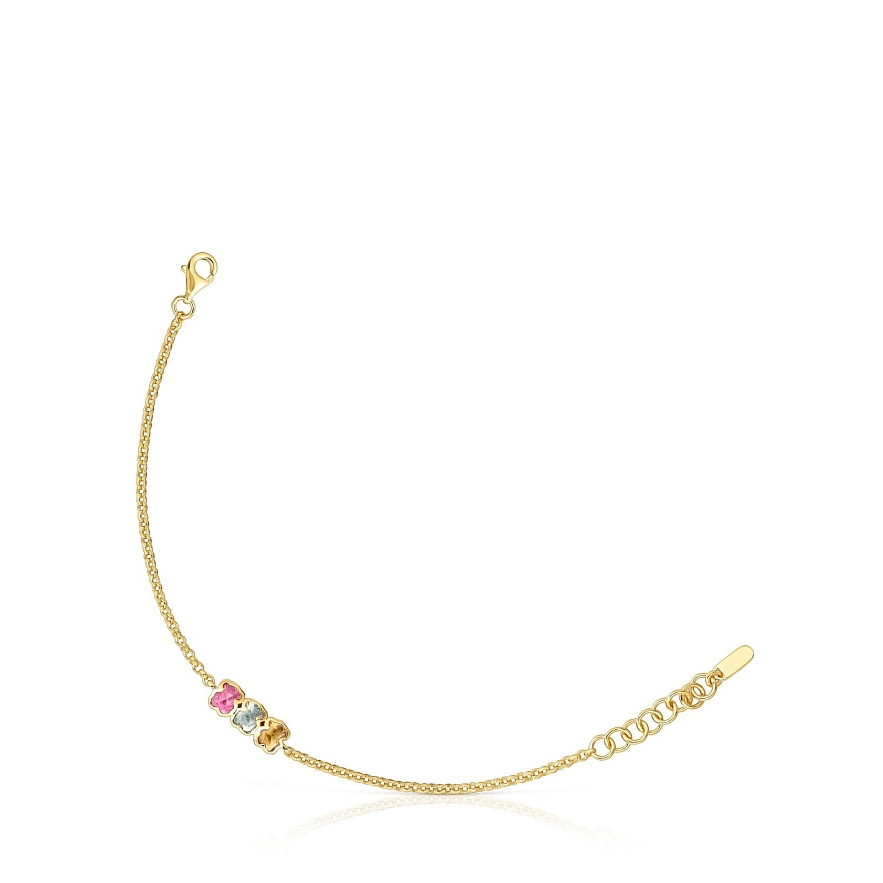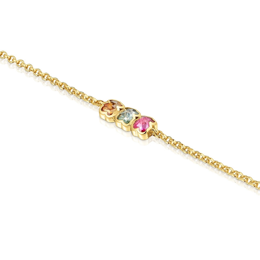 Браслет TOUS Icon Color LGG из серебра 925 пробы с покрытием Vermeil , ограненным рубином, выращенным в лаборатории, ограненным сапфиром мятно-зеленого цвета и ограненным оранжевым сапфиром в форме мишек. Размер мишек: 5 мм. Длина браслета: 17,5 см. Застежка-лобстер. Украшение создано из лабораторно выращенных драгоценных камней.