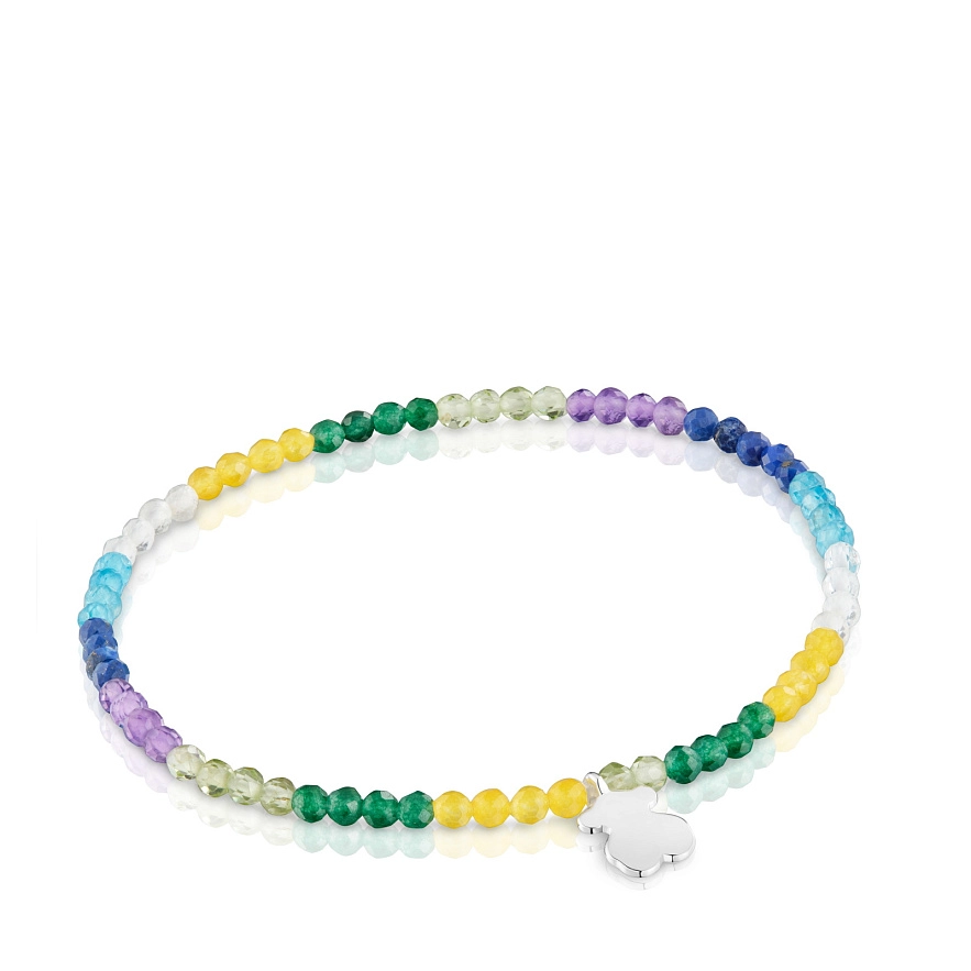 Браслет TOUS Motifs с огранёнными круглыми бусинами из драгоценных камней и мотивом медвежонка из серебра 925 пробы. Драгоценные камни: аметист, перидот, обработанный зелёный халцедон, обработанный жёлтый кварцит, обработанный лазурит и обработанный апатит. Длина браслета: 17 см.