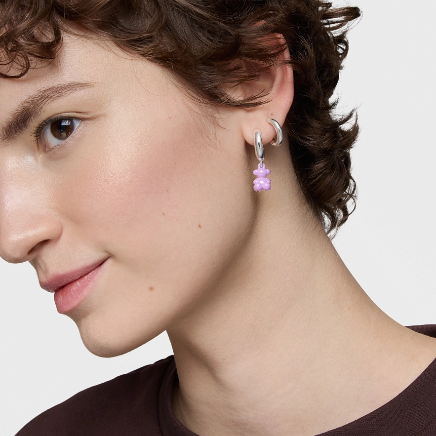Серьги TOUS Bold Bear с двойным мотивом медвежонка из керамики пастельно-сиреневого цвета и подвеской из серебра 925 пробы. Размер серег: 30 мм. Застежка-пусет.