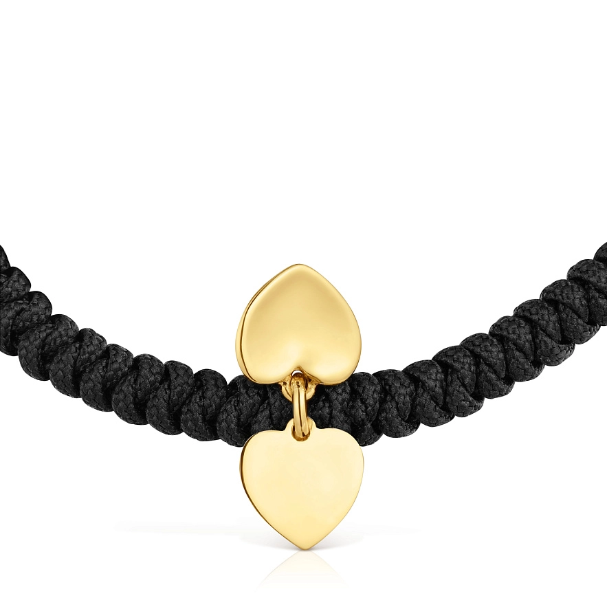 Браслет TOUS Flechazo из 14-каратного желтого золота с мотивом двойного сердца и черным нейлоном. Размер мотива: 7 мм. Длина браслета: 23 см. Застежка-слайдер.