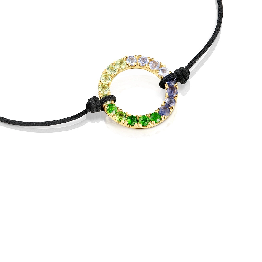 Браслет TOUS Straight из серебра с 18-каратным золотым покрытием и чёрного нейлона с огранными круглыми драгоценными камнями. Драгоценные камни: хромовый диопсид, перидот, танзанит и иолит. Размер мотива: 14 мм. Длина браслета: 23 см. Застежка-слайдер. Изделие изготовлено из серебра 925 пробы с 18-23-каратным золотым покрытием толщиной 3 микрона. Такое качество гарантирует большую долговечность ювелирных изделий.