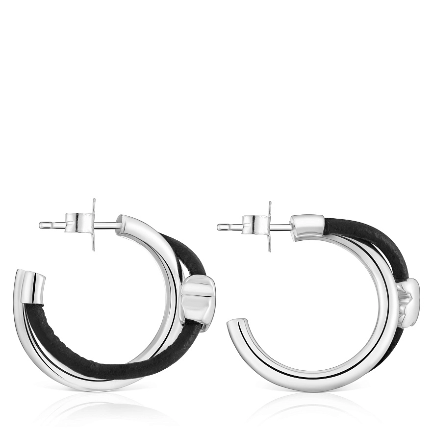 Серьги-кольца TOUS Bold Motif с мотивом медведя из серебра и черного каучука. Размер серег: 24 мм. Застежка-пуссет.