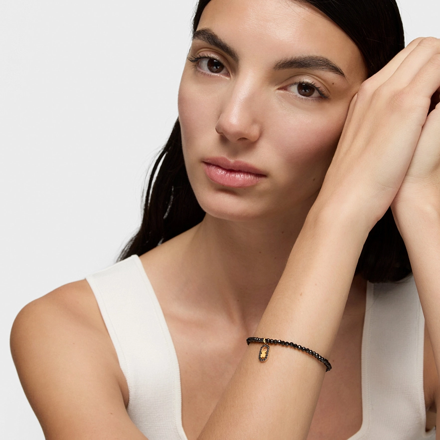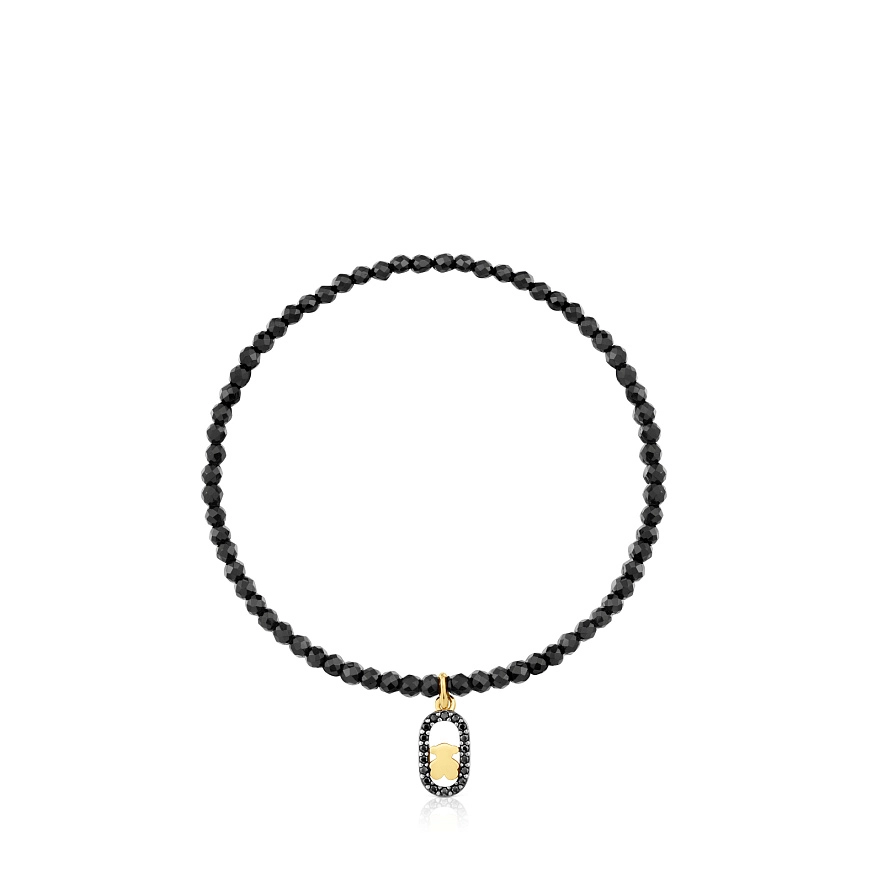 Эластичный браслет TOUS Camille из серебра 925 пробы с 18-каратным золотым покрытием и круглыми фасетированными шпинелями черного цвета. Длина браслета: 17 см. Размер пластины: 11 мм. Изделие изготовлено из серебра 925 пробы с 18-23-каратным золотым покрытием толщиной 3 микрон. Такое качество гарантирует большую долговечность украшения.