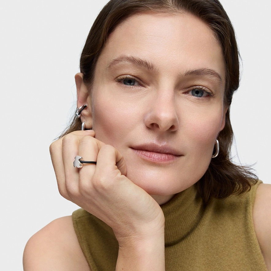Кольцо TOUS Bold Motif из серебра и чёрного каучука с мотивом медведя. Размер подвески: 12 мм.