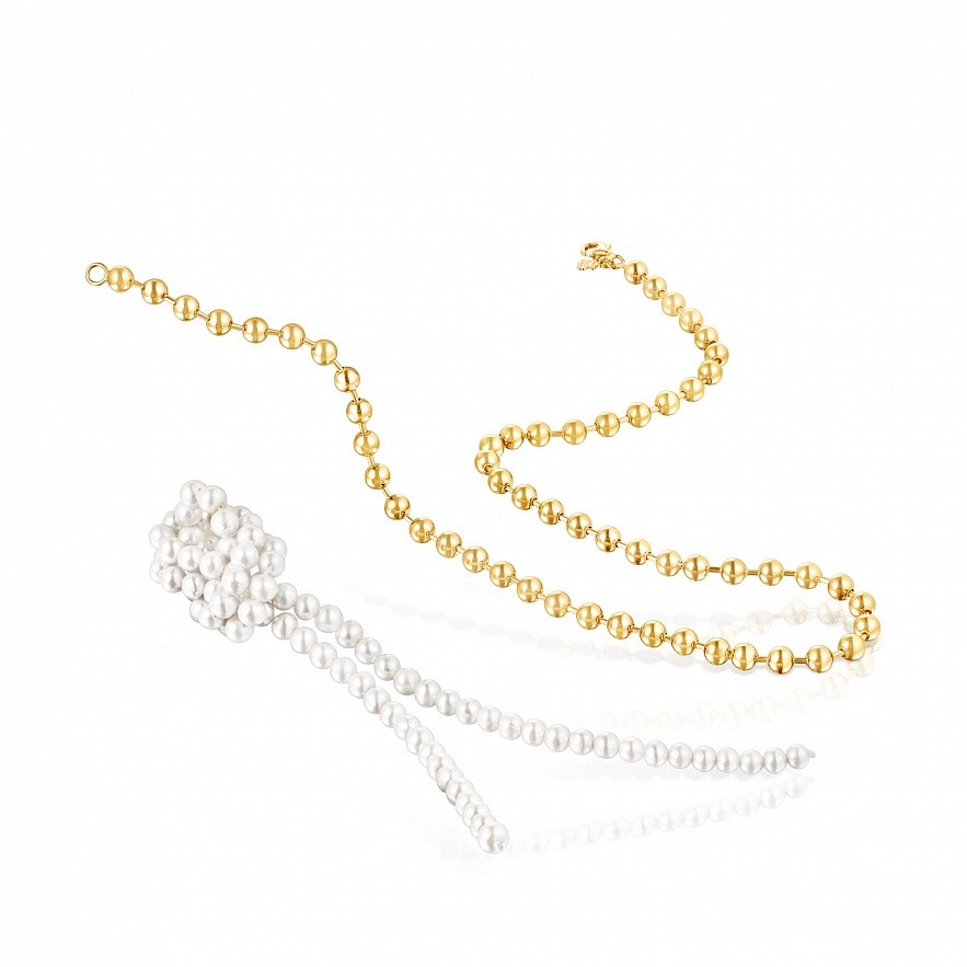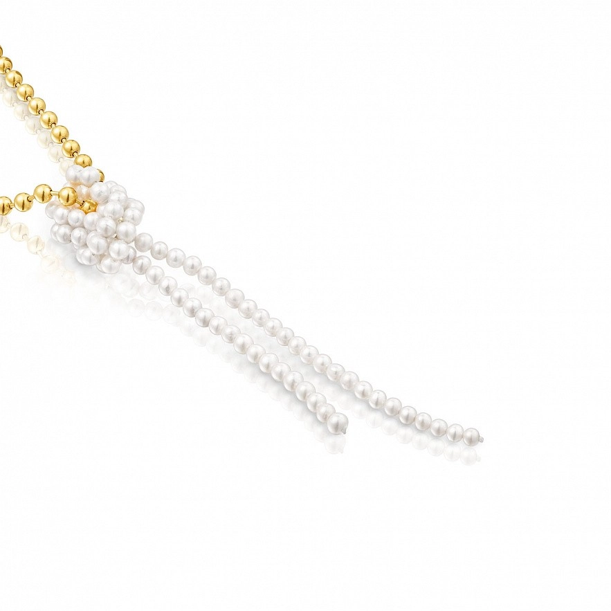 Колье TOUS Gloss из серебра 925 пробы с покрытием Vermeil с цепочкой из шариков и цепочкой из культивированного жемчуга, завязанной по центру. Диаметр шариков: 5 мм. Диаметр культивированного жемчуга: 5 мм. Длина колье: 42 см. Длина кулона: 14 см. Застежка-лобстер. Vermeil : серебро с покрытием золота 18 карат.