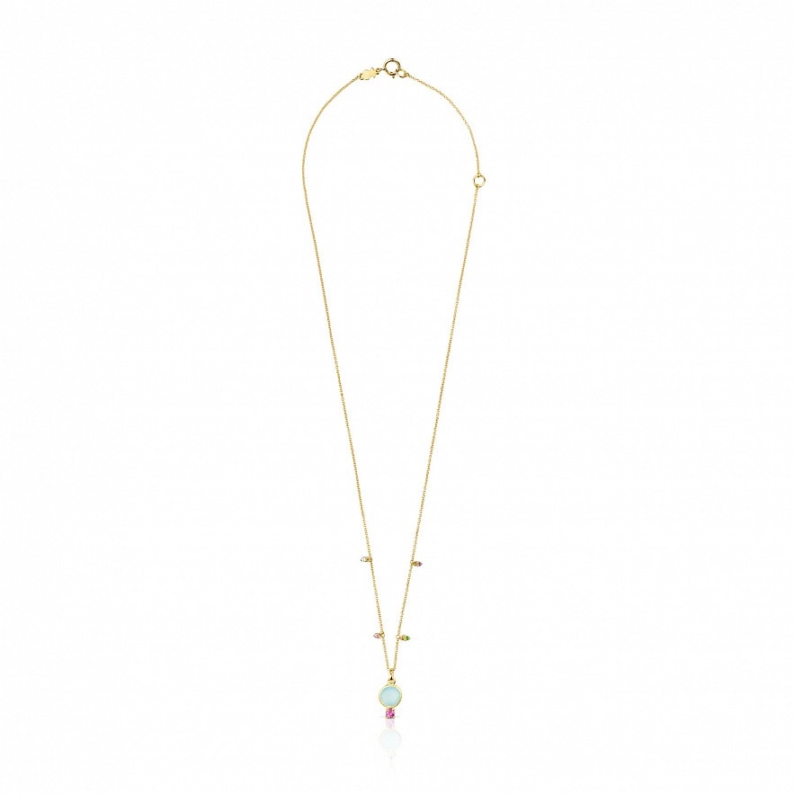 Колье TOUS Virtual Garden из золота 750 пробы с халцедоном 7 мм и родолитом 3 мм. Детали драгоценных камней вокруг цепочки: синий топаз, родолит, диопсид хрома и аметист. Размер деталей из драгоценных камней: 1,5 мм. Застежка - пружинное кольцо. Длина колье: 45 см.