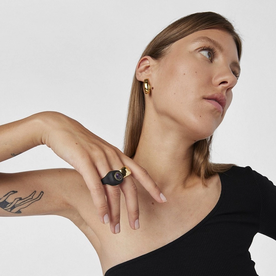 Кольцо-печатка TOUS Virtual Garden из серебра 925 пробы с покрытием Vermeil с камнями аметиста и диопсидов хрома, окружающих основной драгоценный камень. В комплект входит гибкий сменный материал трех разных цветов: фиолетового, зеленого и черного. Внутри есть четыре высечки в форме звезды, окружающие драгоценный камень. Размер драгоценного камня: 9,5 х 7,6 х 4 мм. Ширина кольца: 19 мм. Толщина: 2 мм. Vermeil : серебро с покрытием золота 18 карат.