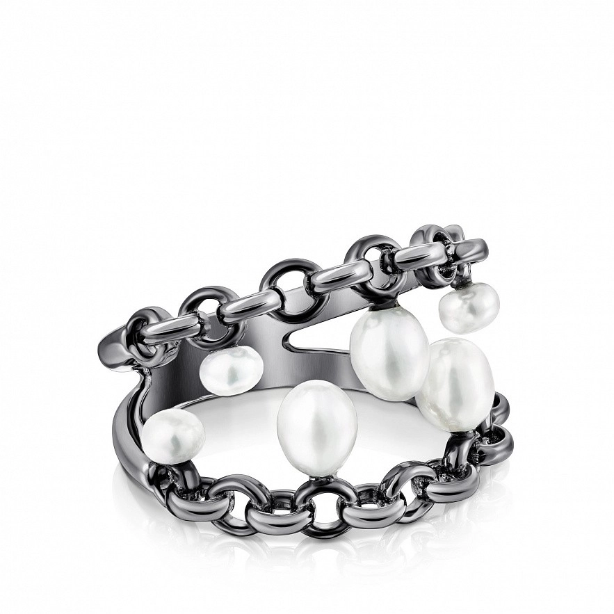 Кольцо TOUS Virtual Garden из темного серебра 925 пробы с культивированным жемчугом разного размера. В центре, между двумя небольшими цепочками кольца, мотив из культивированного жемчуга размером 6 х 4 мм, по бокам - культивированный жемчуг размером 3,5 мм. Толщина верхней части: 9 мм.