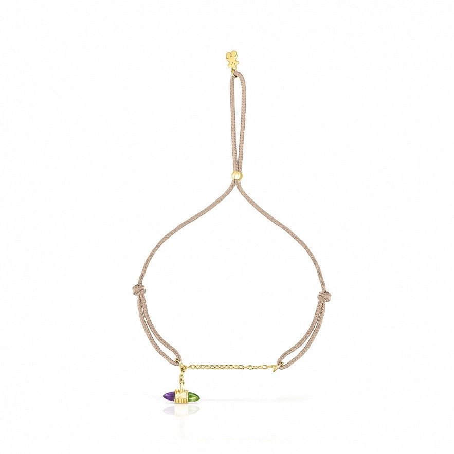Браслет TOUS Lure из золота 750 пробы и нейлона с цепочкой и подвесным золотым шармом с мишкой 2,8 мм, аметистом и перидотом. Размер драгоценных камней: 5 х 2,5 мм. Длина мотива на кулоне: 6 мм. Застежка-слайдер.
