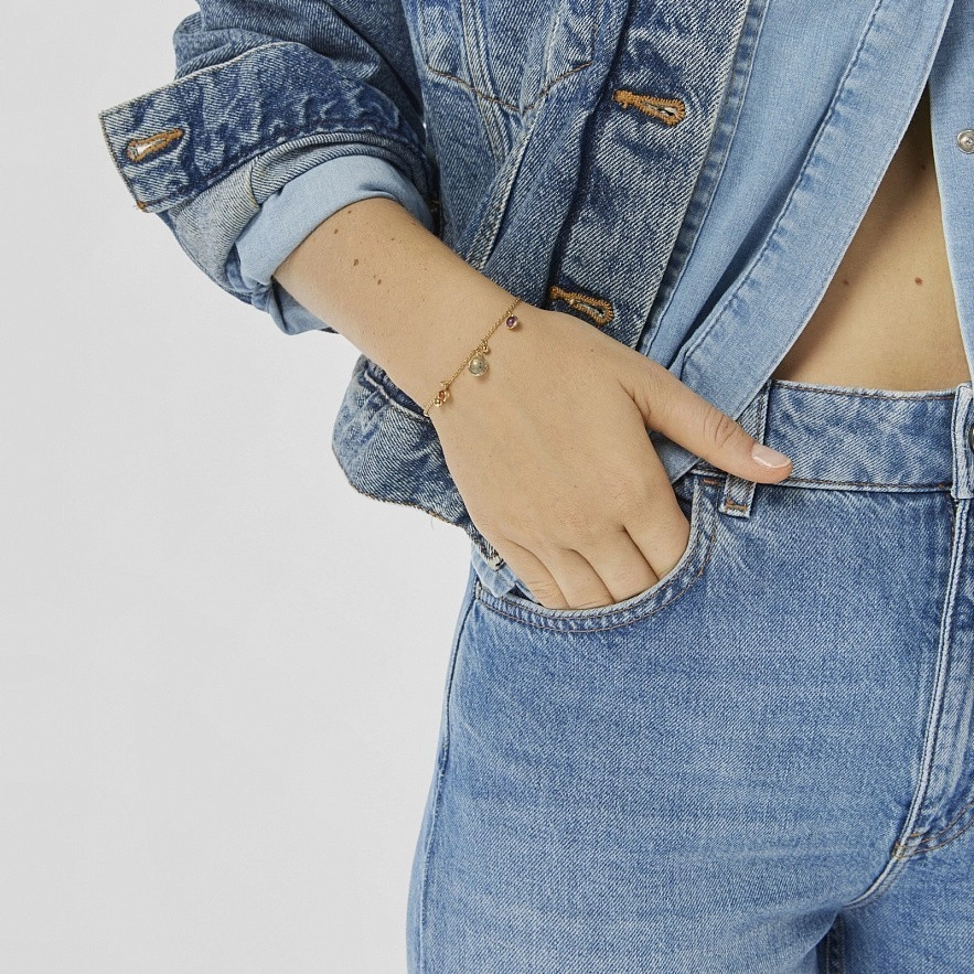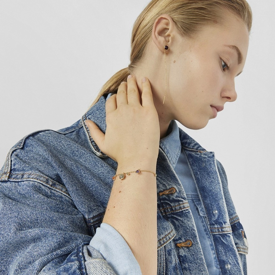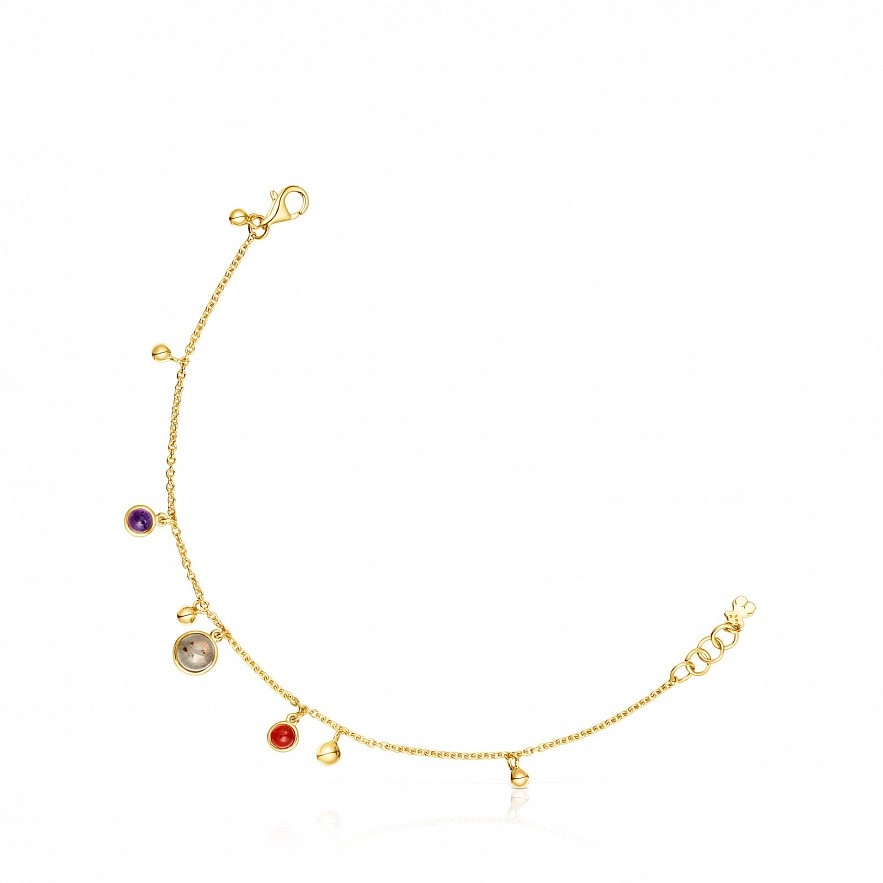 Браслет TOUS Plump из серебра 925 пробы с покрытием Vermeil с висячими элементами. Элементы в форме шара размером 3 мм, с сердоликом размером 4-4,5 мм, с аметистом размером 4-4,5 мм и с лабрадоритом размером 6-6,5 мм. Длина браслета: 17,5 см. Застежка-лобстер. Vermeil : серебро с покрытием золота 18 карат.
