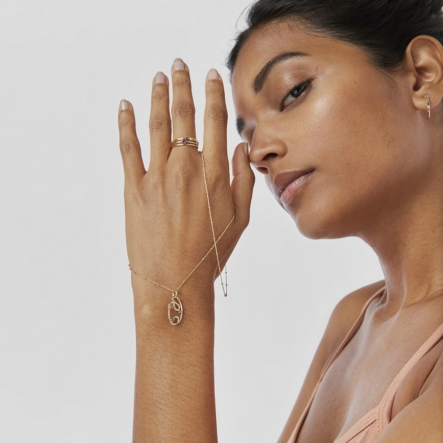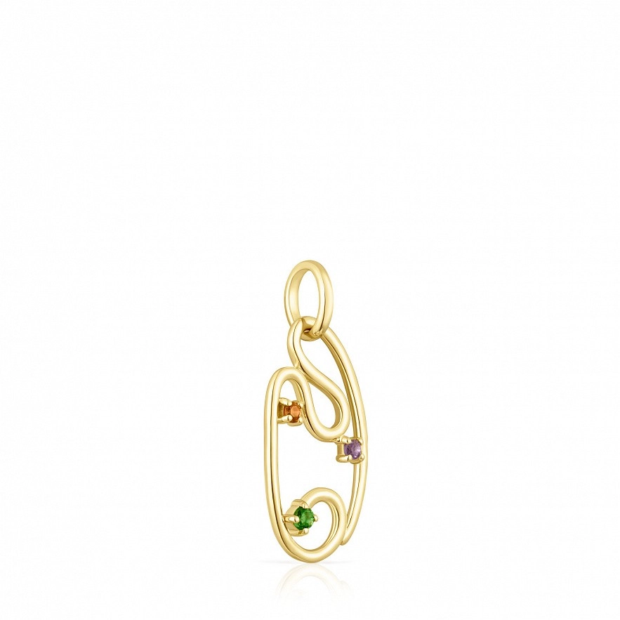 Подвеска TOUS Tsuri из золота 750 пробы с драгоценными камнями, установленными вокруг силуэта овала. Драгоценные камни: гранат, аметист и диопсид хрома. Размер граната и аметиста: 1,5 мм. Размер диопсида хрома: 1,75 мм. Размер овала: 18 мм. Данный товар не включает в себя цепочку.