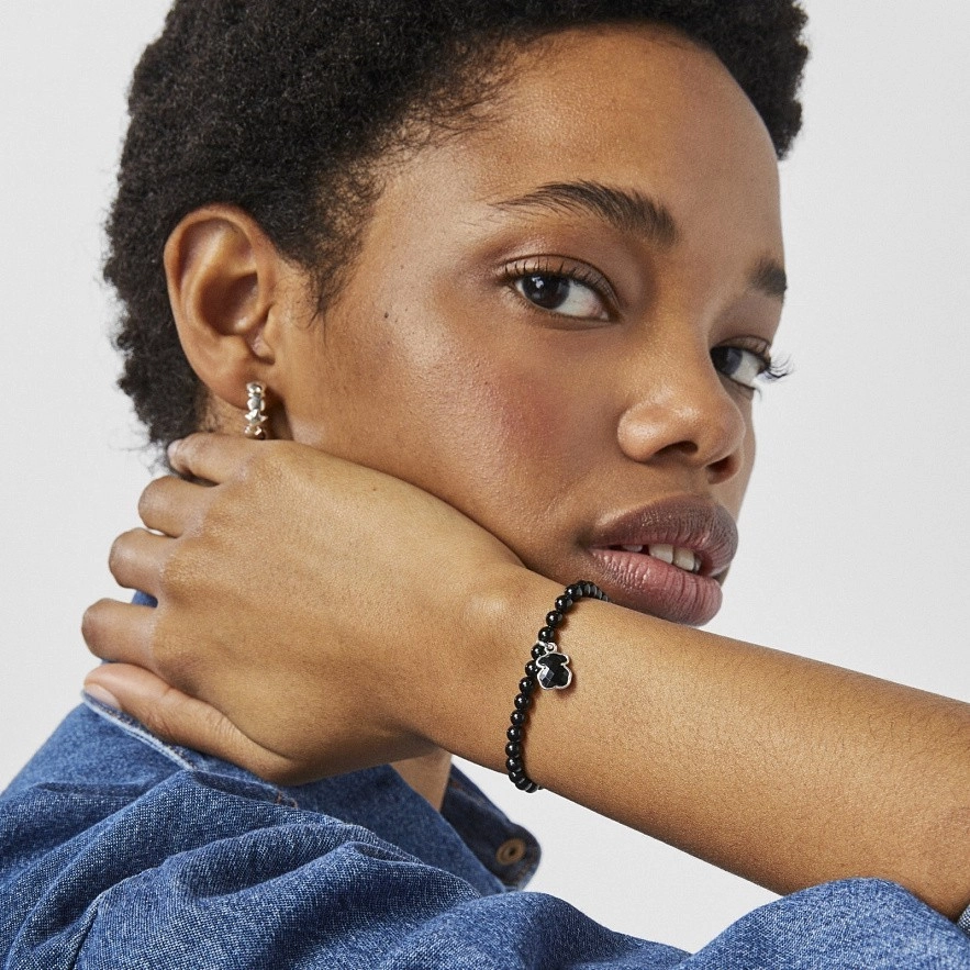 Браслет TOUS Icon Color из стерлингового серебра с гладкими шариками из оникса размером ~4 мм и подвеской в виде медведя из оникса диаметром 9 мм.