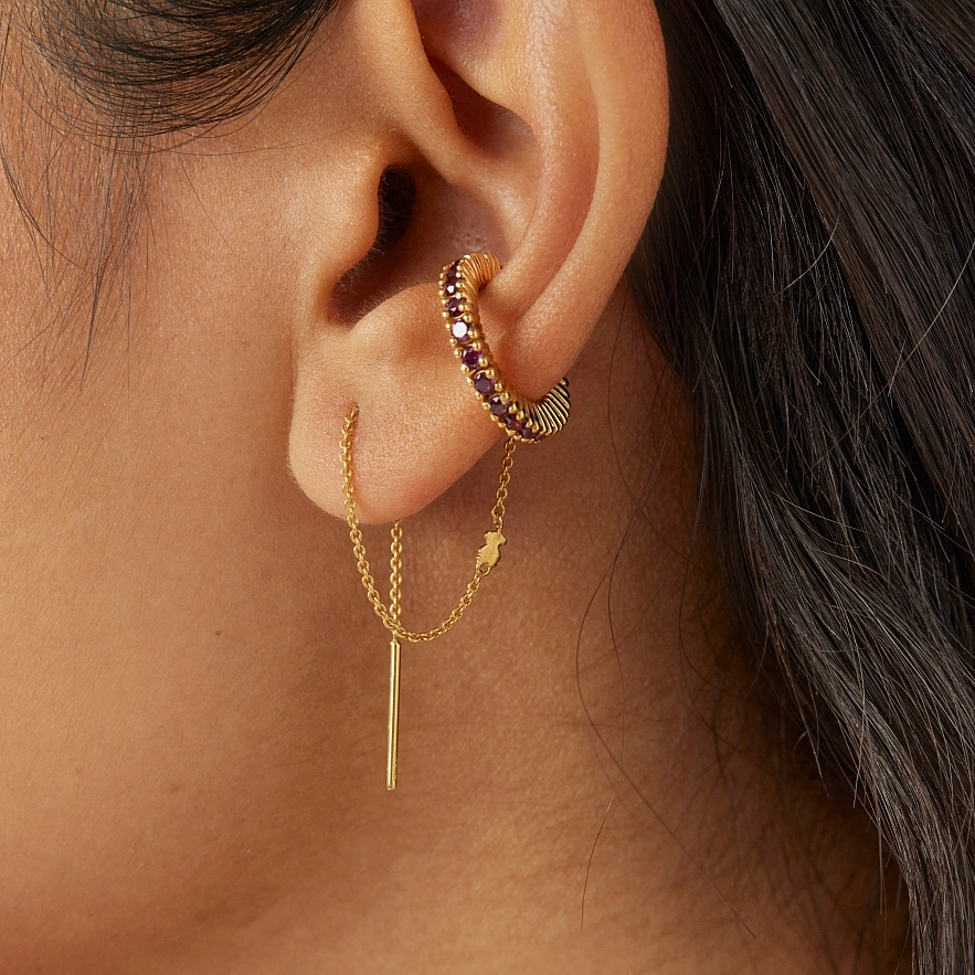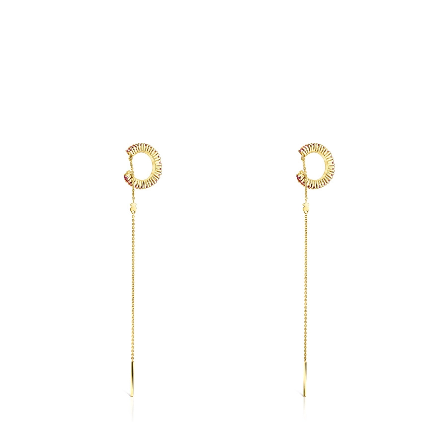 Серьги-каффы TOUS Straight из серебра 925 пробы с длинной цепочкой и мотивом медведя, а также каффой с родолитами, расположенными по верхнему краю. Благодаря длинной цепочке вы можете создавать любую форму в зависимости от ваших пирсингов.