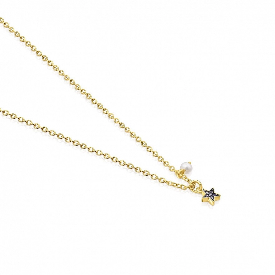 TOUS New Motif колье из серебра 925 пробы с покрытием Vermeil с узором в виде звезды диаметром 5мм с голубыми сапфирами и жемчужиной диаметром 3мм. Общая длина ожерелья: 45 см.